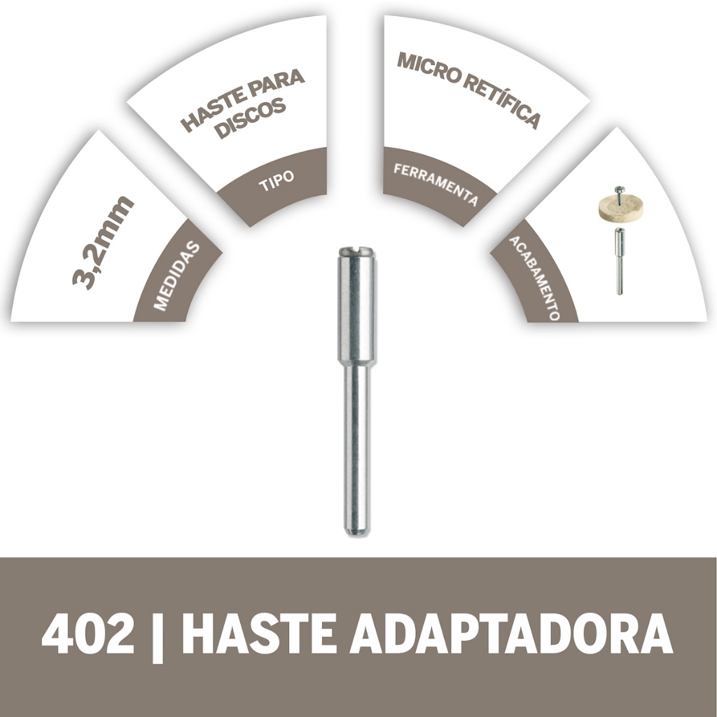 Haste Adaptadora Para Discos de Corte 402 Dremel Vantagens: - Indicado para montar vários acessórios, como discos de polir em feltro ou discos de corte; - Usado com os discos 409, 411, 412, 413, 420, 423E, 425, 426, 429, 456, EZ471SA, EZ472SA, EZ473SA, 511E, 512E, 540, e 541. Dados Técnicos: - Marca: Dremel; - Referência: 402; - Diâmetro: 1/8" (3.2mm); - Peso bruto: 0,010kg. Itens Inclusos: - 1 Haste Adaptadora Para Discos de Corte 402 Dremel.