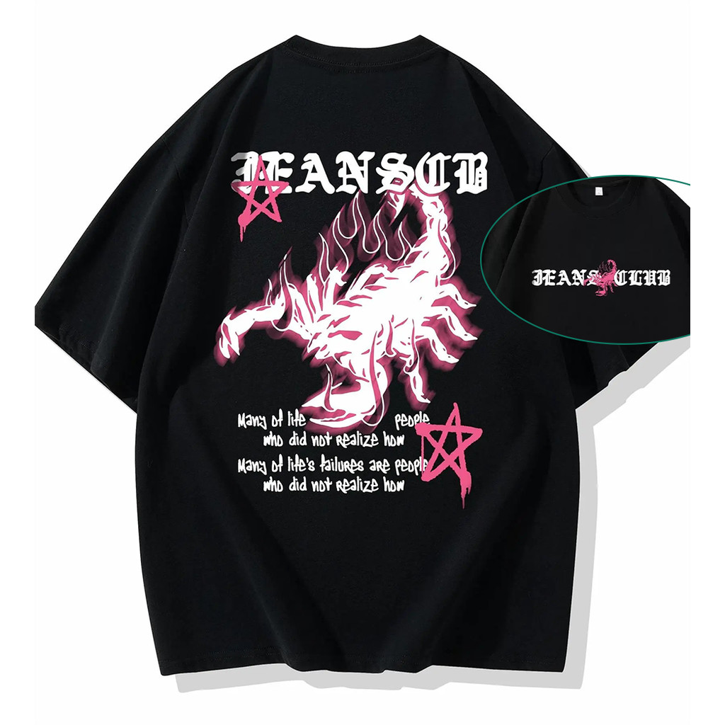 Manga curta de algodão puro com gola redonda, padrão escorpião, padrão frente e verso, Casual All-Match