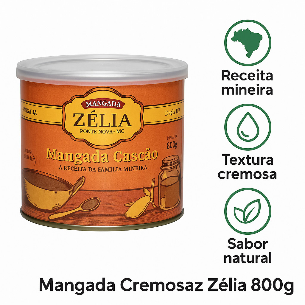 Mangada Cascão Zélia 800g – Receita Mineira Original na Lata A tradicional Mangada Cascão Zélia é feita com a verdadeira receita da família mineira, direto de Ponte Nova – MG. Cremosa, saborosa e naturalmente doce, é ideal para comer com queijos, pães, ou simplesmente pura. Sua textura artesanal e sabor de fruta madura encantam em qualquer ocasião. ℹ Benefícios: ✅ Receita tradicional da família mineira ✅ Cremosa e fácil de espalhar ✅ Sabor autêntico da fruta do caju ✅ Ideal para queijos, torradas e sobremesas ✅ Sem conservantes artificiais ✅ Lata metálica de 800g – mais sabor e durabilidade ℹ Ficha Técnica: ✅ Produto: Mangada Cascão ✅ Marca: Zélia ✅ Origem: Ponte Nova – MG ✅ Peso líquido: 800g ✅ Embalagem: Lata com tampa plástica ✅ Textura: Cremosa ✅ Ingredientes: Polpa de caju e açúcar ✅ Validade: Vide embalagem ✅ Não contém glúten