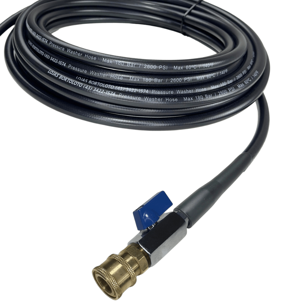 Mangueira de Engate Rápido Marca Bortoloto com Esguicho Regulável Compatível para Lavadora de Alta Pressão Michelin MPX130, Makita e Black Decker Antes de comprar, confira nas fotos se a conexão da mangueira do lado onde acopla na máquina é igual à da sua lavadora. Mangueira Para Lavadora Alta Pressão Nylon 1/4 - Produto novo, com garantia e à pronta entrega; Acompanha - Bico curto: Com fácil manuseio, é ideal para uso em lugares pequenos e apertados, possibilitando direcionar a água de forma precisa no local desejado. Possui dois tipos de jato: Jato reto (concentrado): para limpezas pesadas; Jato leque (vassourinha): para limpezas leves. - Mini registro: Quando fechado, aciona o "stop total" desligando sua lavadora, possibilitando a troca rápida dos acessórios. - Mangueira com trama de nylon interna: Mangueira própria para lavadoras de alta pressão, com qualidade superior, resistente, flexível e durável. Composto de nylon resistente à abrasão, às intempéries e ao óleo, evitando rachaduras na mangueira. - Conector máquina/encaixe: O conector da mangueira pode ser visualmente diferente da original, mas as medidas são exatamente iguais, ou seja, são totalmente compatíveis para o modelo da lavadora informada no anuncio. - Garantia:90 dias para defeitos de fabricação (defeitos causados por mau uso não serão cobertos pela garantia).