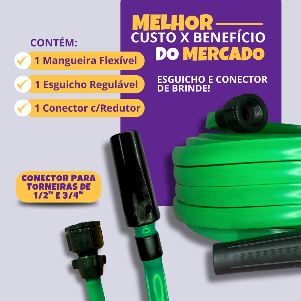Mangueira de Jardim Chata Antitorção Não Dobra Flexível 10, 15, 20, 25, 30 e 50 Metros 7/16 Esguicho ⚠️ + Brinde: 1 gatinho e 1 conector com redutor ✅Sobre o produto: ✔ Diâmetro externo: 7/16 polegada ✔ Parede interna reforçada com 1.5mm ✔ Gatilho e conexão de torneira ✔ Antitorção ✔ Cor: Verde ✅Escolha na Variação: ✔ Metragem ✔ 10m ✔ 15m ✔ 20m ✔ 25m ✔ 30m ✔ 50m ✅Diferencial do nosso produto: ✔ Ótima qualidade ✔ Alta durabilidade ✔ Envio super rápido ✔ Flexível e fácil de manusear ✔ Feita com materiais de alta qualidade, nossa mangueira é resistente a torções, dobras e vazamentos, proporcionando uma durabilidade excepcional mesmo nas condições mais adversas. ✔ Facilita suas tarefas de jardinagem, proporcionando um fluxo de água constante e poderoso, onde resistência encontra flexibilidade para resultados excepcionais. ✅ Benefícios para o dia a dia: ✔ Torna a rega do jardim rápida e prática ✔ Evita que a mangueira dobre ou enrosque durante o uso ✔ Proporciona maior conforto e agilidade na limpeza de quintais, carros e calçadas ✔ Permite uso prolongado sem desgaste ou vazamentos ✔ Ideal para uso doméstico ou profissional ✔ Mantém a durabilidade mesmo em uso frequente ✅Conteúdo da embalagem: ✔ 1 Mangueira tripla camada ✔ 1 Esguicho ✔ 1 União de torneira ✅Uso/indicação: ✔ Uso doméstico em geral ✔ Lavar calçadas e carro ✔ Regar jardim/quintal ✔ Atividades profissionais ✅Perguntas Frequentes: ✔ Seu produto tem garantia? R= Durante o período de garantia de 3 meses, estamos à disposição para resolver quaisquer problemas relacionados à qualidade ou defeitos de fabricação que possam surgir com a sua mangueira de jardim. Se você encontrar qualquer problema dentro deste período, entre em contato conosco e faremos o possível para corrigir a situação de forma rápida e eficiente. ✔ A Mangueira de Jardim pode ficar Exposta ao Sol? R= A exposição prolongada ao sol pode ter vários efeitos adversos sobre uma mangueira de jardim, incluindo Ressecamento, Rachaduras, Perda de Flexibilidade, Perda de Flexibilidade e Redução da Vida Útil. Portanto, é recomendável evitar deixar a mangueira de jardim exposta ao sol por longos períodos, optando por armazená-la em um local protegido quando não estiver em uso. ✔ Serve para Lavadora de Alta Pressão? R= Embora nossa mangueira de jardim seja robusta e durável, gostaríamos de ressaltar que não a recomendamos para uso com lavadoras de alta pressão. Essas lavadoras são projetadas para operar com mangueiras específicas que suportam as altas pressões geradas pelo equipamento. 🚚 Envio Super Rápido 🥰 Para dúvidas, estamos à disposição no chat