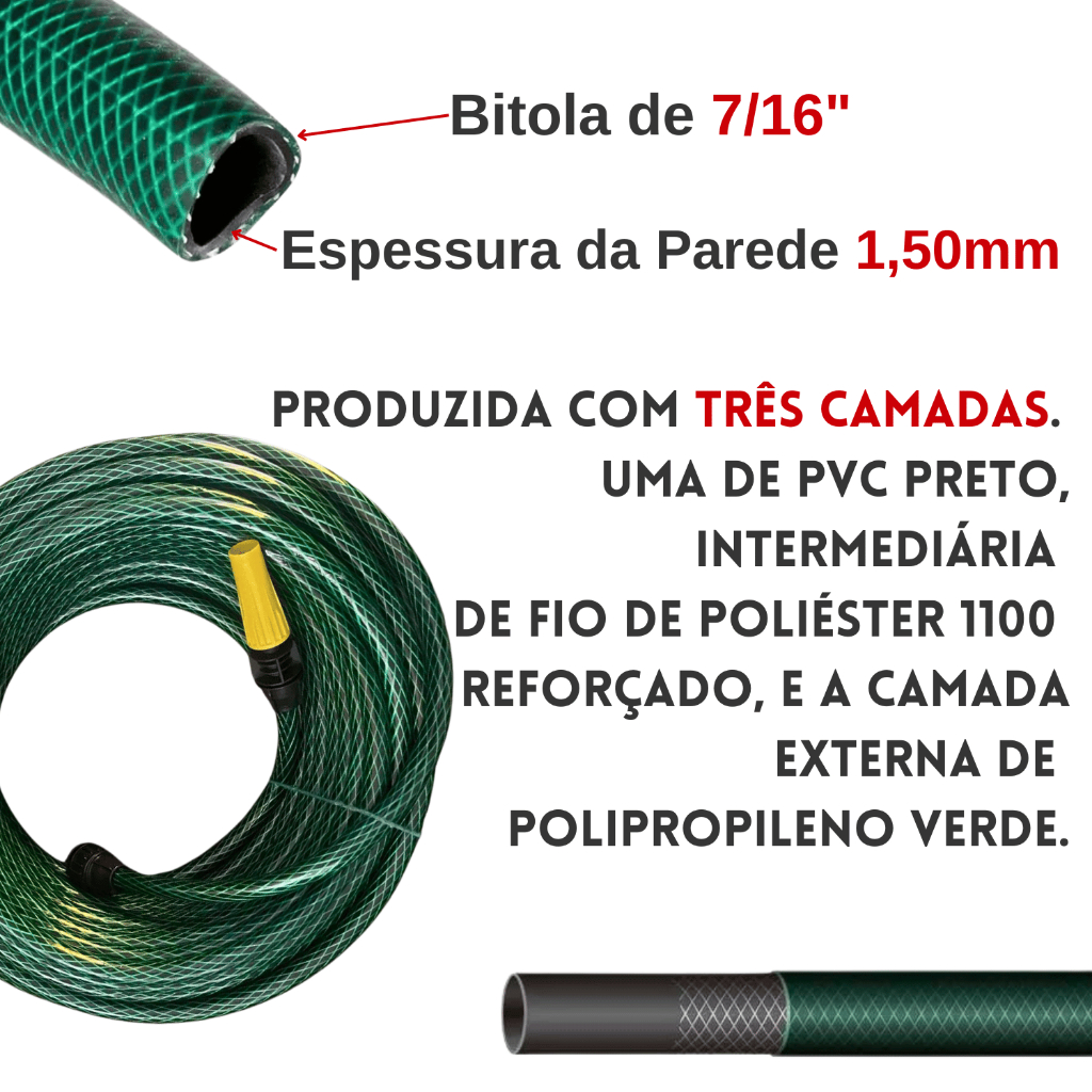 Casa Dias Comercio Eletrônico Olá a Casa Dias foi criada para facilitar o dia-a-dia de seus clientes. Prezamos pelo atendimento personalizado, produtos de qualidade, entrega rápida e preços competitivos. Fique tranquilo para comprar com quem está disposto a te oferecer o melhor atendimento, e caso tenha algum problema após a compra, conte com nossa equipe de pós venda para solucioná-lo. CASA DIAS, nossa missão é encantar você! Mangueira Trançada para Jardim: Seu Parceiro Versátil para Todas as Tarefas! IMPORTANTE: Esta mangueira possui uma parede de 1,50mm, tornando-a mais fina. Se você busca uma mangueira mais robusta, confira nossa PT300 com 2,80mm de espessura. Facilidade e Praticidade em um Só Produto: Pronta para usar: Engates rosqueados e esguicho montados garantem que você comece a usar imediatamente. Conexão universal: Compatível com qualquer torneira padrão, tornando a instalação simples e rápida. Multifuncionalidade total: Perfeita para regar jardins, lavar carros, fazer limpezas e muito mais. Resistência e Durabilidade de Longa Duração: Construção reforçada: Mangueira trançada com parede de 1,5mm, projetada para maior resistência. Proteção contra intempéries: Resiste a pressões de até 20bar, com diâmetro interno de 7/16". Cuidados para maior durabilidade: Armazene em local adequado, evite exposição prolongada ao sol e limpe após o uso para garantir uma vida útil ainda mais longa. Escolha o Tamanho Ideal para Você: Disponível em comprimentos de 10m, 15m, 20m, 25m ou 30m, para atender qualquer necessidade. Kit Completo e Pronto para Uso: Tudo incluso: Mangueira, bico esguicho, conector de torneira e adaptador de redução – um conjunto completo para facilitar seu dia a dia. Qualidade e Economia: Melhor custo-benefício: Une praticidade, durabilidade e multifuncionalidade com um preço acessível. Faça mais, com menos: Regue seu jardim, deixe seu carro brilhando e sua casa impecável com facilidade. Garanta já sua Mangueira Trançada para Jardim e aproveite mais praticidade e qualidade todos os dias!