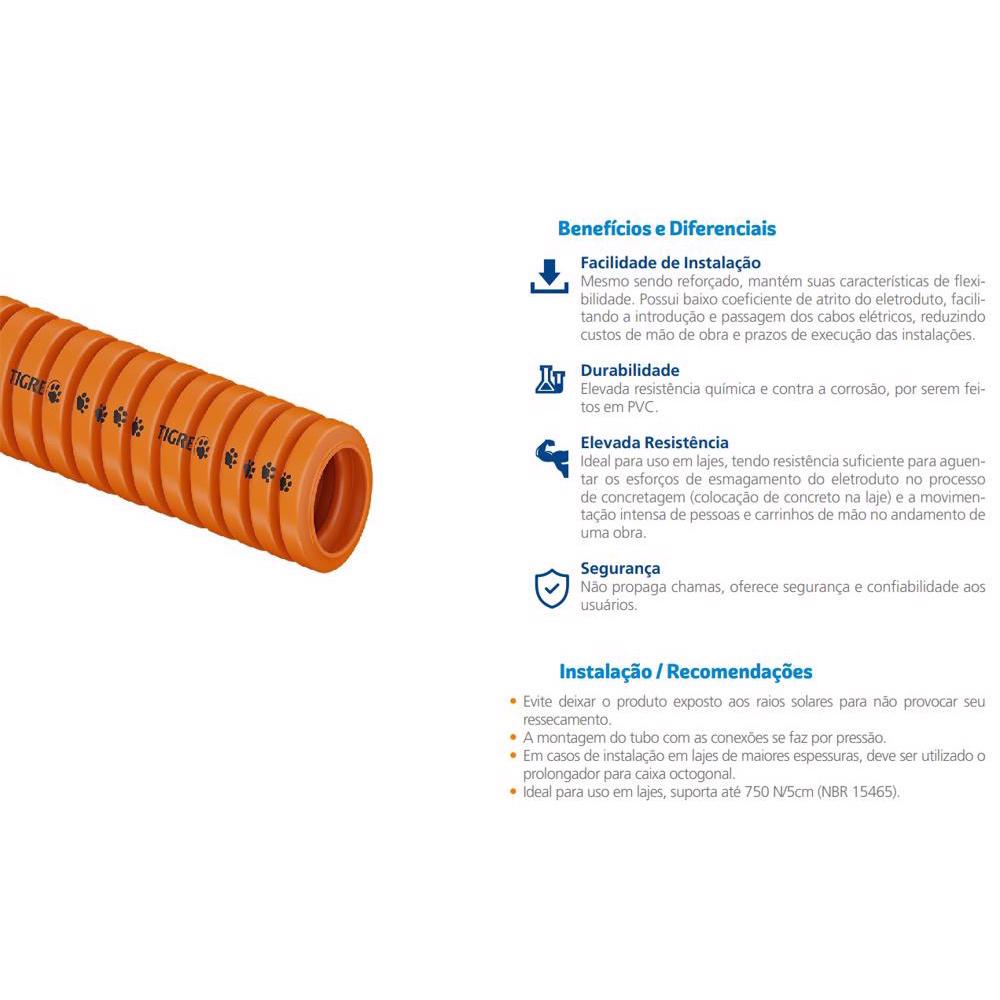Não propaga chamas, não dobra e não amassa. Isso sim é segurança! O Eletroduto Flexível Tigreflex® Reforçado possui marcação orientativa metro a metro para facilitar o seu manuseio e instalação. Sua bobina foi projetada para que o eletroduto seja facilmente desenrolado, mantendo o rolo organizado. Solução ideal para proteger as instalações elétricas da sua obra. ROLO COM 25 METROS