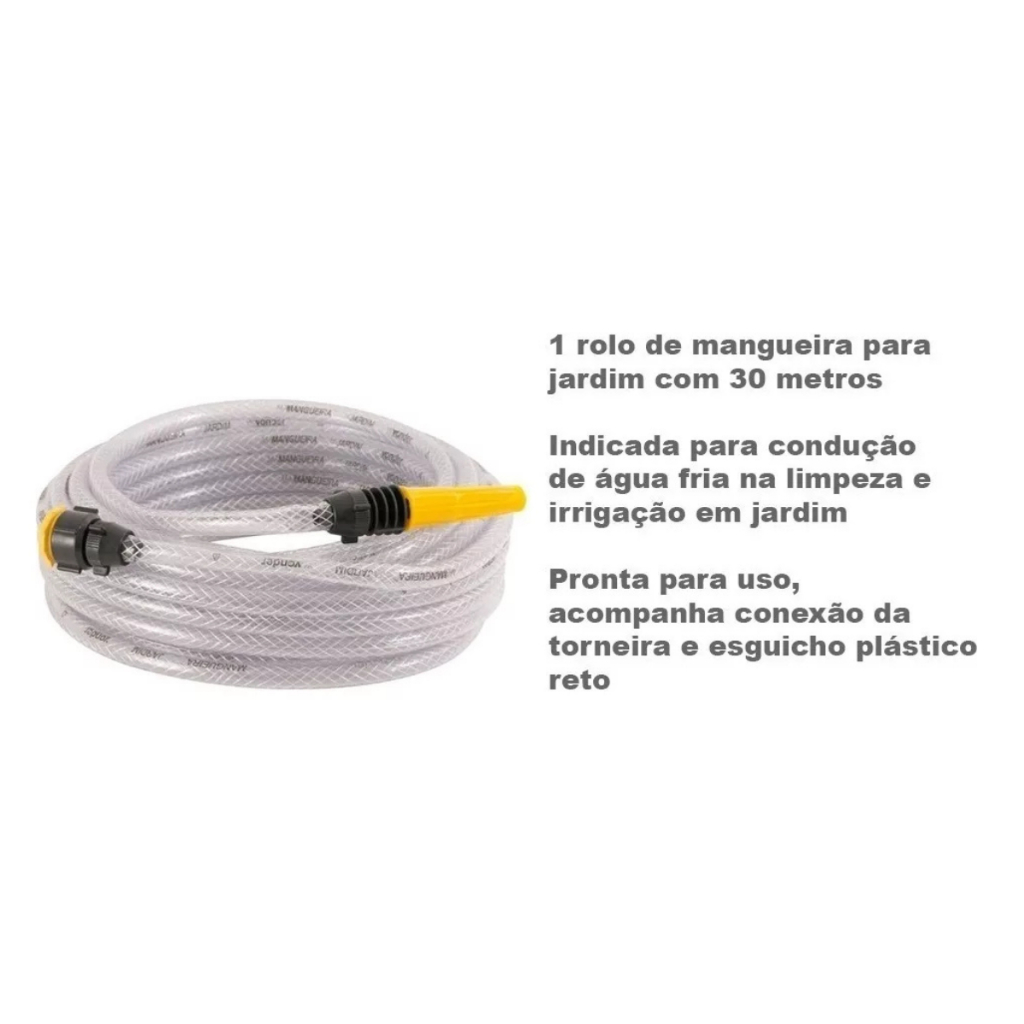 Mangueira para jardim, trançada, transparente, 30 m, VONDER Pronta para uso, acompanha a conexão da torneira e esguicho plástico reto. Indicada para condução de água fria na limpeza e irrigação em jardim. Especificações: Material da mangueira: PVC Diâmetro interno: 7/16" - 11,1 mm Espessura da parede: 1,8 mm Pressão máxima de trabalho: 140 lbf/pol² Cor da mangueira: Transparente Massa aproximada (peso) (kg): 2,176 kg Conteúdo da Embalagem: 1 rolo de mangueira para jardim com 30 metros.