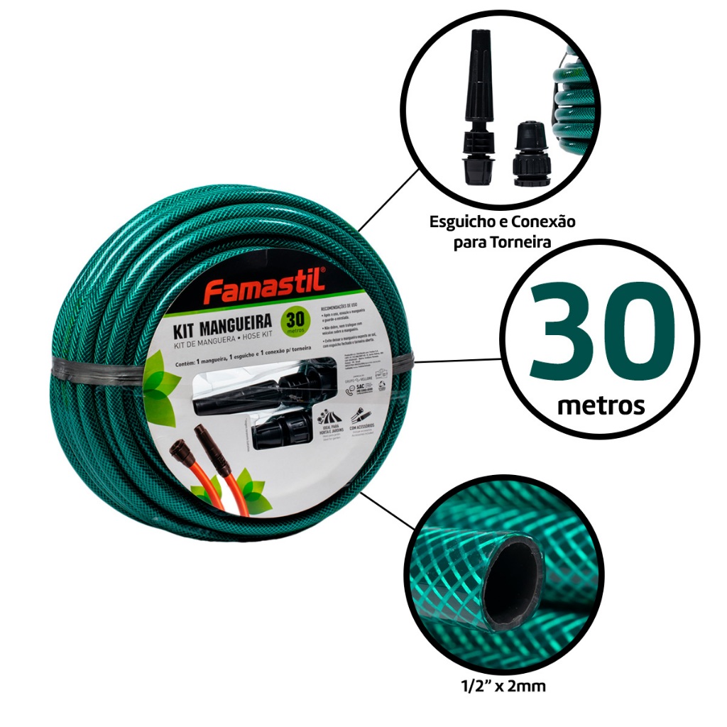 Mangueira para Jardim Trançada 30M 7/16 x 1,5mm Kit Esguicho e Conector Verde Famastil