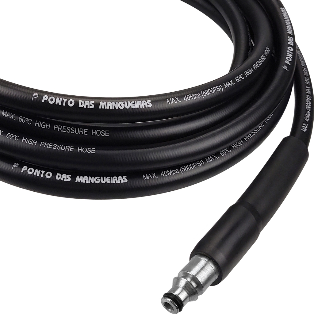 Ponto das Mangueiras: empresa especialista em mangueiras e acessórios para lavadoras de alta pressão. Mangueira de alta pressão com trama de nylon. - Produto novo, com garantia e à pronta-entrega; - Suporte e assistência total pós-venda; - Vendemos também uma proteção de plástico em espiral para a mangueira, aumentando ainda mais sua durabilidade, consulte valores. - Mangueira com trama de nylon interna: Mangueira própria para lavadoras de alta pressão, com qualidade superior, resistente, flexível e durável. Composto de nylon resistente à abrasão, às intempéries e ao óleo, evitando rachaduras na mangueira. - Conector e manopla/porca: Os conectores e/ou manoplas/porcas da mangueira podem ser visualmente diferentes da original, mas as medidas e roscas internas são exatamente iguais, ou seja, são totalmente compatíveis para o modelo de sua lavadora. Instruções de uso: 1 - Retire a mangueira velha, se houver, da lavadora e da pistola; 2 - Conecte a nova mangueira na lavadora e na pistola; 3 - Antes de ligar a lavadora, abra a torneira e aguarde a água passar pela bomba e por toda a extensão da mangueira, eliminado o ar do sistema; 4 - Ligue a lavadora, botão “on/off”. Obs.: Há diferentes tipos de lavadoras, mas, geralmente, elas possuem dois encaixes. A mangueira nova já vem com os respectivos engates compatíveis, portanto, basta retirar a mangueira velha e colocar a nova, muito simples e prático. - Garantia: 90 dias para defeitos de fabricação (defeitos causados por mau uso não serão cobertos pela garantia). Emitimos nota fiscal - Loja física: Franca - SP.