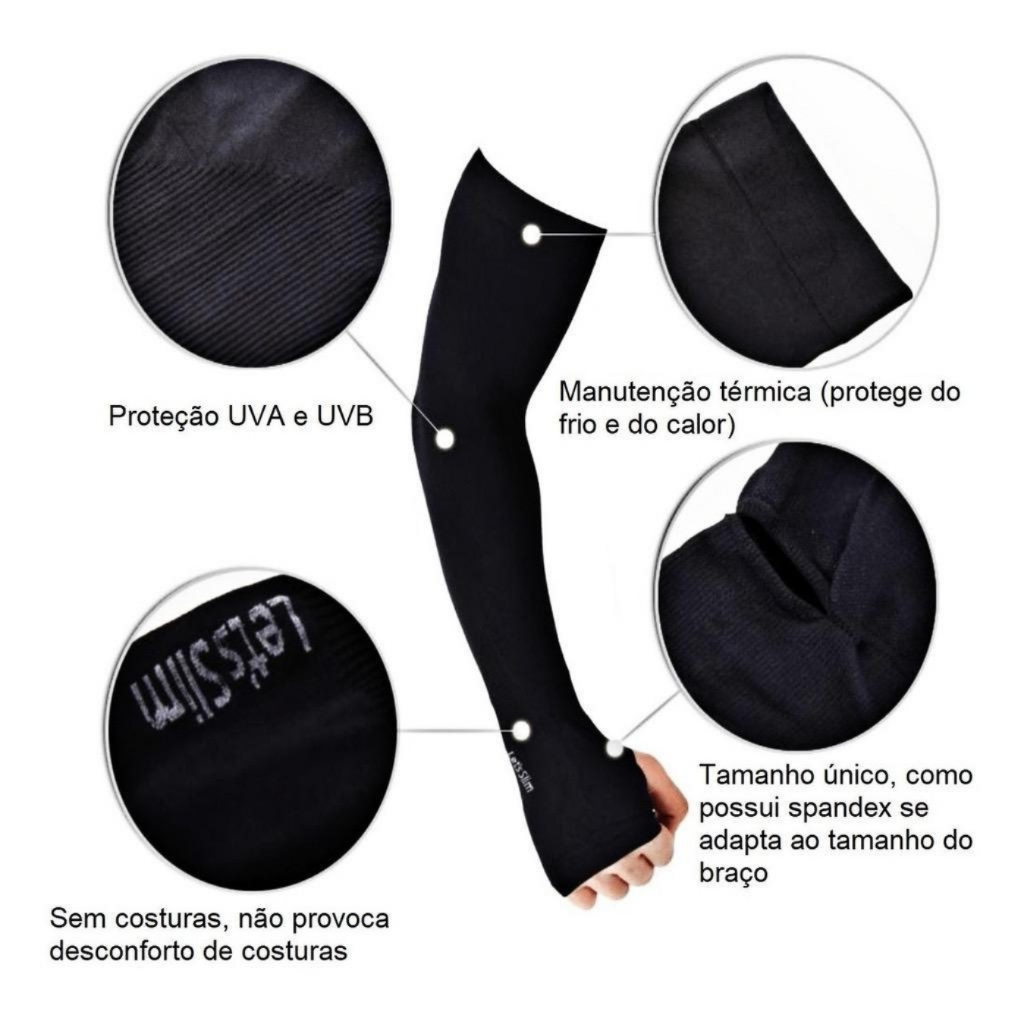Manguito com Dedo – Proteção Solar UV50+, Esportivo e Confortável O Manguito com Dedo é a escolha ideal para quem busca conforto, estilo e segurança durante atividades ao ar livre. Fabricado com tecido de alta qualidade, é perfeito para quem pratica ciclismo, corrida, motociclismo ou trabalha exposto ao sol por longos períodos. Com proteção solar UV50+, ele evita queimaduras, manchas e o ressecamento da pele. Esse modelo conta com encaixe no dedo (modelo com abertura), o que garante melhor fixação no braço, sem escorregar durante o uso. Ideal para uso esportivo, profissional e no dia a dia. 🧤 Benefícios do Manguito Manga Longa com Dedo: Proteção UV50+ contra raios solares Tecido elástico e respirável de secagem rápida Conforto térmico e alta compressão Modelo térmico e de compressão que reduz a fadiga muscular Encaixe no dedo (modelo com abertura para dedo) Costuras reforçadas para maior durabilidade Ideal para uso em corrida, moto, ciclismo, academia, caminhada, pesca e direção