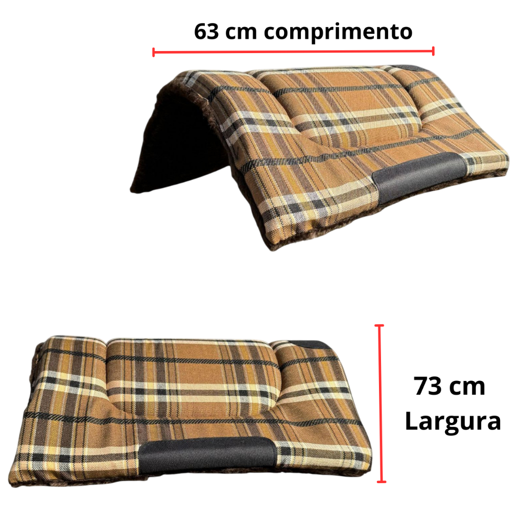 Manta Quarto de Milha para Selas e Arreios – Conforto e Resistência Manta modelo Quarto de Milha, ideal para selas americanas, australianas, de prova e diversos modelos de arreios. Fabricada em tecido Premium de estofamento reforçado, possui proteção lateral em material sintético que evita o desgaste pelo atrito com a sela. Conta com enchimento interno de espuma de média densidade (3 cm) e feltro automotivo (1 cm), garantindo melhor transpiração, conforto e segurança para o cavalo durante a montaria. Medidas aproximadas: Comprimento: 63 cm | Largura: 74 cm | Espessura: 4 cm Produto de alta durabilidade, perfeito para quem busca desempenho, conforto e resistência no dia a dia da lida ou nas provas.