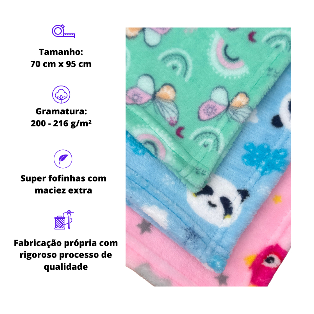 Manta Bebê Mantinha Cobertor Menino Menina Descubra o conforto e a suavidade da Manta/Mantinha Bebê da marca P2 Têxtil, projetada especialmente para envolver com carinho os pequenos. Com medidas de 95 cm de altura e 70 cm de largura, esta manta é ideal para proporcionar calor e aconchego em diversas situações, seja em casa, em passeios ou durante momentos de descanso. Feita em poliéster de alta qualidade, a manta é leve, fácil de lavar e secar, mantendo a praticidade que as mamães e papais precisam no dia a dia. Seu design encantador é perfeito para meninos e meninas, com estampas fofinhas e lindas. A Coberta/Cpbertor Bebê não só é uma peça funcional, mas também um elemento que agrega estilo ao ambiente. Pode ser utilizada em berços, cadeirinhas ou como um colo aconchegante, garantindo assim a versatilidade que você procura. Transforme o momento do descanso em uma experiência prazerosa com esta manta que combina qualidade, conforto e um toque de fofura. Invista no bem-estar dos seus pequenos com um produto que se destaca pela sua delicadeza e praticidade. Composição: 100% Microfibra Poliéster Peso: média de 170 gr cada manta Produto fabricado no Brasil (Pronta entrega) Perguntas frequentes: 1. Qual o tamanho da mantinha? R: Nossa manta mede 70cmx95cm 2. Que material ela é feita? R: Fabricada em fleece, tecido super fofinho, 100% poliéster. 3. Posso lavar ela na máquina? R: Sim, pode ser lavada em máquina. E uma ótima notícia: Seca Super Rápido!!!