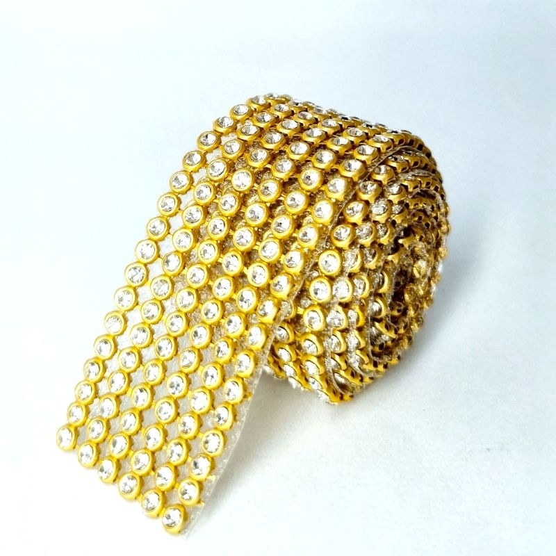 Manta de strass importada original, com pedras de vidro lapidado e brilho especial. Ideal para: Bijuterias, laços, customizações, tiaras, lembrancinhas, chinelos e artesanatos em geral. Composição= Vidro e Metal. Cor: Dourado e Prata. Comprimento: 45 cm