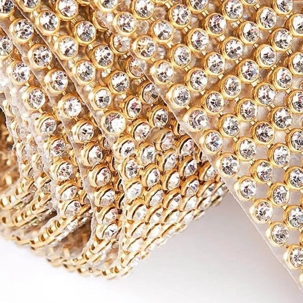 CARACTERÍSTICAS DO PRODUTO: Quantidade: 1 unidade; Tamanho: 5 x 45 cm; Material: Strass; Cor: Prata ou Dourada Pode ser utilizada para confecção de laços, tiaras, chinelos, bolsas, cases (celular), roupas e artesanato em geral. Inspire-se, combine e crie!