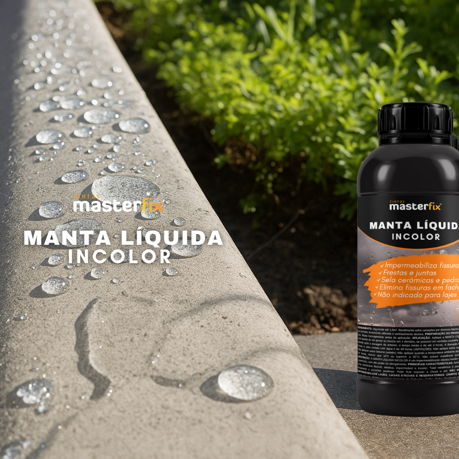 Manta Líquida Incolor Masterfix – Impermeabilizante Transparente para Fissuras, Fachadas e Cerâmicas Descrição do Produto A Manta Líquida Incolor Masterfix é um impermeabilizante de alta tecnologia, desenvolvido especialmente para vedar fissuras, frestas e juntas, proporcionando proteção invisível e duradoura. Sua fórmula à base de polímeros acrílicos forma uma camada transparente e flexível, ideal para selar cerâmicas, pedras, rejuntes e fachadas sem alterar a aparência original da superfície. Com secagem rápida e excelente aderência, é a escolha ideal para quem busca eficiência, praticidade e acabamento limpo em obras e reformas. Principais Benefícios • Impermeabiliza fissuras e microfissuras com excelente aderência; • Veda frestas e juntas, evitando infiltrações; • Sela cerâmicas, pedras e rejuntes sem alterar a cor; • Elimina fissuras em fachadas, mantendo o acabamento original; • Não indicado para lajes expostas, piscinas ou áreas de imersão. Modo de Aplicação 1. Limpe bem a superfície, removendo poeira, mofo e resíduos. 2. Aplique com pincel, rolo ou trincha. 3. Utilize 2 a 3 demãos cruzadas, respeitando o tempo de secagem entre elas. 4. Após a cura total, o produto forma uma película protetora transparente e resistente. Indicado Para • Fachadas externas • Paredes com microfissuras • Pedras naturais e decorativas • Revestimentos cerâmicos • Rejuntes e superfícies porosas Importante • Produto incolor, não altera o visual do acabamento. • Uso indicado apenas em superfícies verticais ou inclinadas. • Não aplicar em lajes, piscinas ou locais com acúmulo constante de água. Informações Técnicas • Acabamento: Incolor (transparente) • Base: Polímeros acrílicos em meio aquoso • Aplicação: Pincel, rolo ou trincha • Secagem total: 24h • Rendimento: Varia conforme o tipo de superfície e porosidade Sobre a Marca A Masterfix é referência nacional em tintas, resinas e impermeabilizantes de alto desempenho.Com tecnologia própria e controle de qualidade rigoroso, entrega produtos profissionais com preço justo, garantindo resultados duradouros e satisfação total.