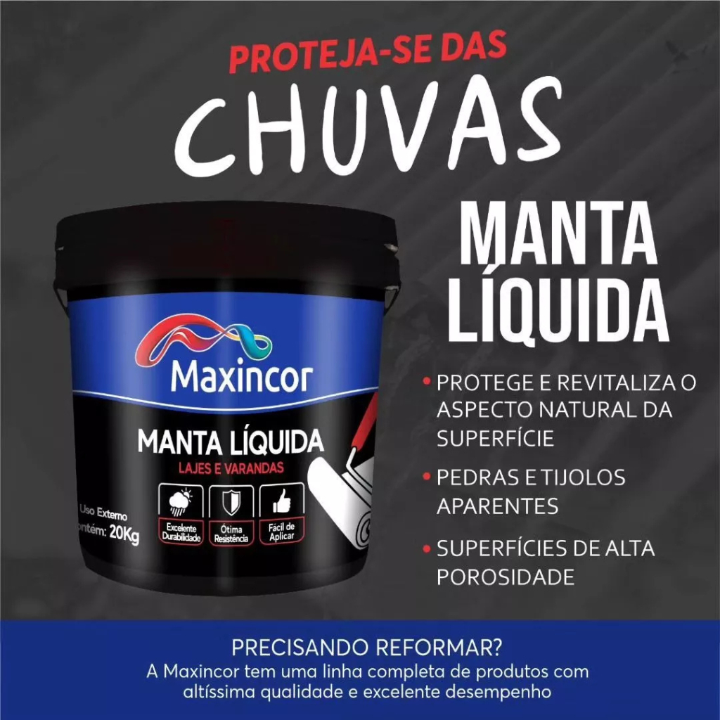 | Manta Liquida Várias Cores 20Kg Impermeabilizante - Maxincor este produto | R$ 189,90 | — | 4.7/5 | 15 |
