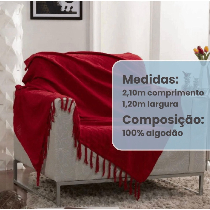Manta Para Sofá Luxo Gigante 120x210 Tipo Capa De Sofá Protetora ✅Sobre o produto: ✔ Manta de Sofá Grande 2,10 x 1,20 ✔ Decorar e conservar seu sofá ✔ 100% algodão ✔ Medidas aproximadas: 2,10 x 1,20 ✔ Com detalhes em franja que dão um charme a mais na sala ✔ Escolha a cor Desejada ✅Diferencial do nosso Produto: ✔ Alta Durabilidade ✔ Resistência a lavagens em máquina de lavar ✔ Secagem rápida ✔ Não precisa passar ✔ Não desbota ✔ Não faz bolinha ✔ Excelente Qualidade ✔ Super Macio ✔ Confortável ✔ Envio Rápido ✅ATENÇÃO: Nossos produtos são a pronta entrega, estaremos enviando dentro de 24hrs após a confirmação do pagamento.🚀 ✅QUALQUER DÚVIDA, ESTAMOS A DISPOSIÇÃO.