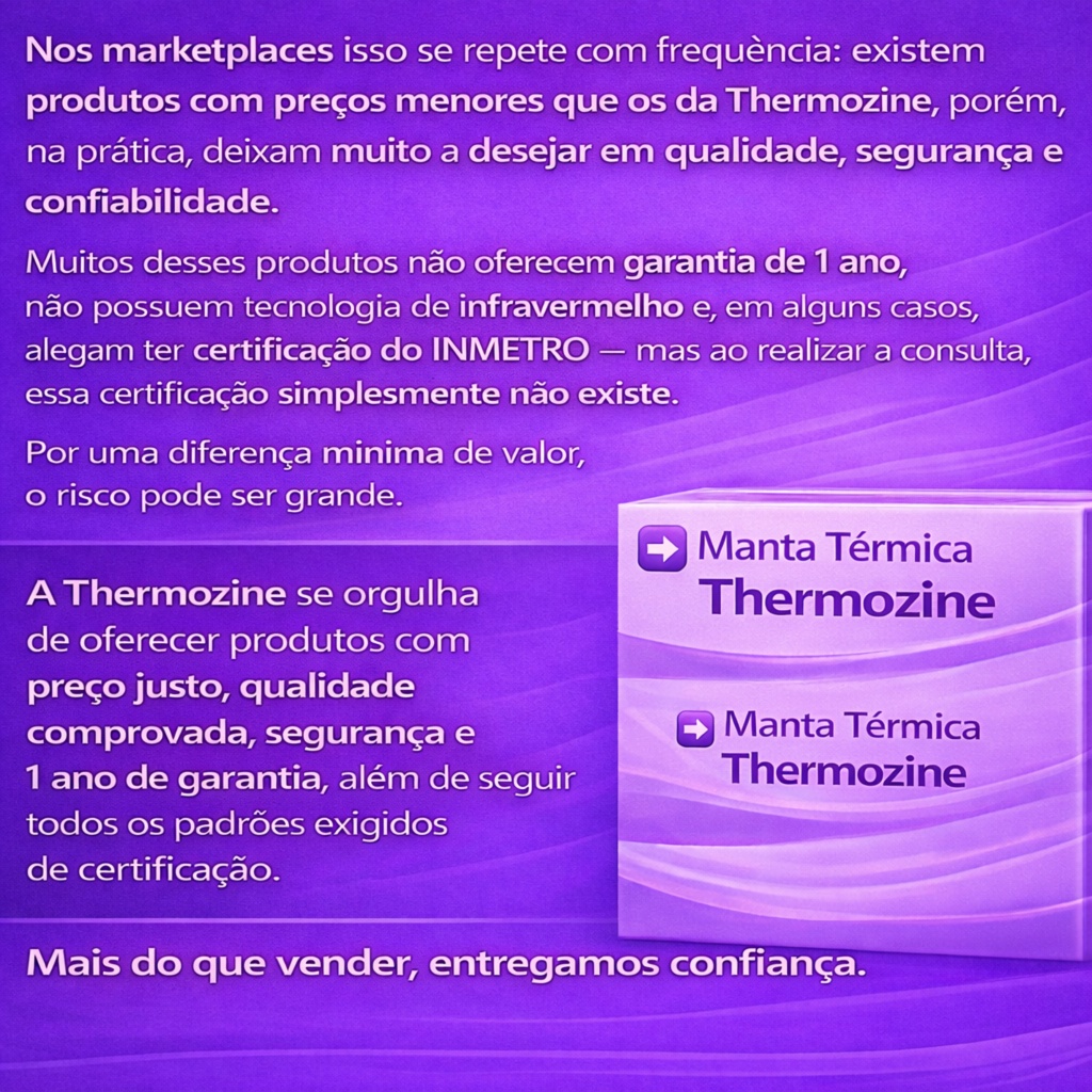 Manta Térmica Estética Corporal Classic Thermozine Corpo inteiro Padrão 1,50 x 1,30 MT COM INFRAVERMELHO BIVOTS A Manta Térmica Classic Thermozine Indicada para uso profissional e doméstico, oferece aquecimento controlado, conforto e segurança. Ideal para tratamentos estéticos, relaxamento muscular e bem-estar diário. Projetada para oferecer aquecimento uniforme, controle preciso e máxima segurança, é a escolha certa para clínicas de estética, spas e profissionais que buscam qualidade, confiabilidade e resultados consistentes. 🔥 Como Funciona A manta realiza o aquecimento de forma gradual e controlada, permitindo ao profissional ajustar a intensidade do calor conforme a necessidade do tratamento e a sensibilidade do cliente. O controle de tempo integrado garante sessões mais seguras, evitando uso prolongado e proporcionando total tranquilidade durante a aplicação. ⭐ Características Técnicas ✔ Bivolt Automática – adapta-se automaticamente à tensão elétrica (127V / 220V) ✔ 4 Níveis de Temperatura – ajuste de aquecimento suave até calor mais intenso ✔ Controle de Tempo Regulável – programável de 40 a 90 minutos ✔ Velcros de Ajuste – melhor fixação e adaptação ao corpo ✔ Alta Retenção de Calor – mantém a temperatura estável e uniforme ✔ Sistema de Segurança Integrado – proteção contra superaquecimento, fusível de segurança e resistência dimensionada para uso contínuo ✔ Design Anatômico – envolve o corpo de forma confortável e eficiente ✔ Materiais Resistentes – fácil higienização e alta durabilidade 🛡️ Certificações e Conformidades 🔒 INMETRO Produto em conformidade com as normas brasileiras de segurança elétrica. 🏥 AFE ANVISA Empresa com Autorização de Funcionamento da ANVISA, habilitada para fabricação e comercialização de equipamentos. 📦 Indicações de Uso • Tratamentos estéticos corporais • Relaxamento térmico • Procedimentos terapêuticos com uso de calor • Uso profissional em clínicas de estética e spas • Uso domestico 🏆 Por que escolher a Thermozine? A Thermozine é especializada no desenvolvimento de equipamentos térmicos, oferecendo qualidade, segurança, durabilidade e excelente custo-benefício, atendendo às exigências do mercado.