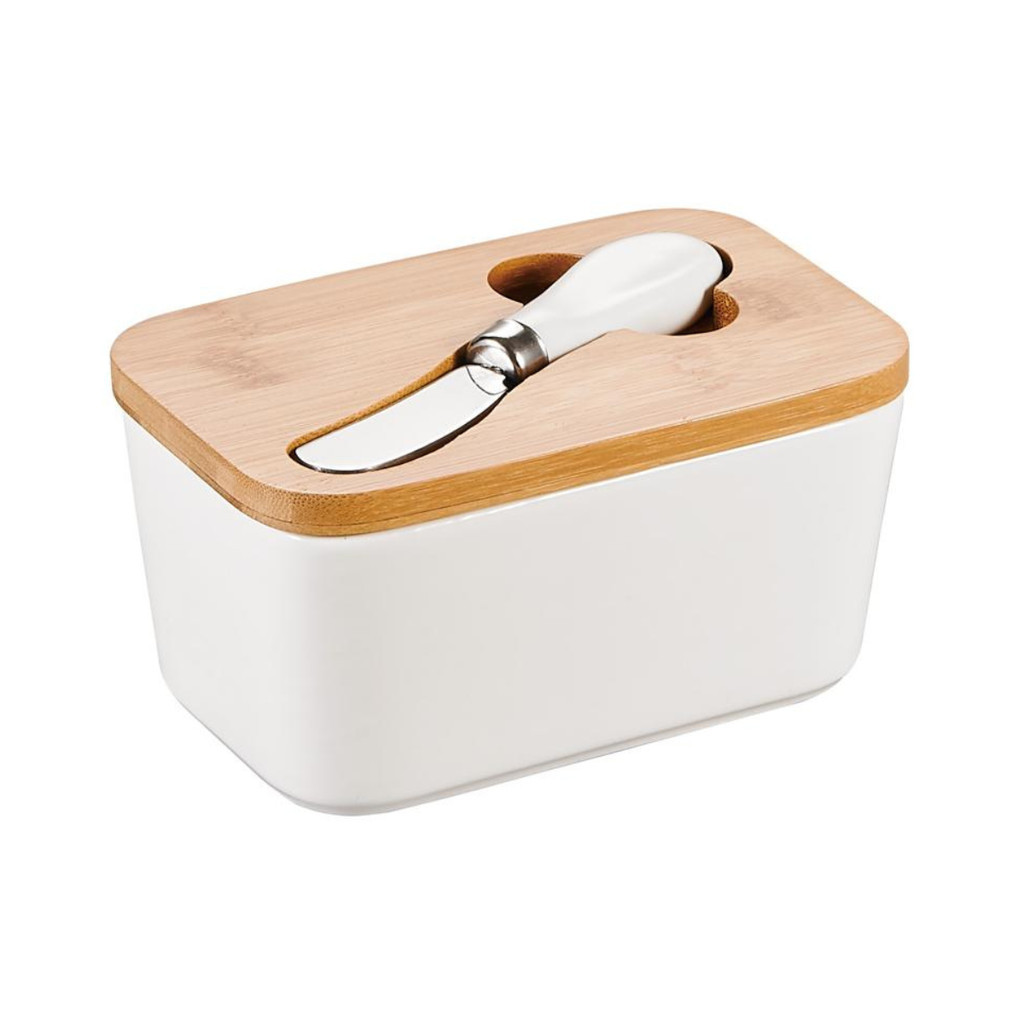 MANTEIGUEIRA DE PORCELANA COM ESPATULA + TAMPA DE BAMBU CASUAL HAUSKRAFT 400ML 15X8,5X7CM