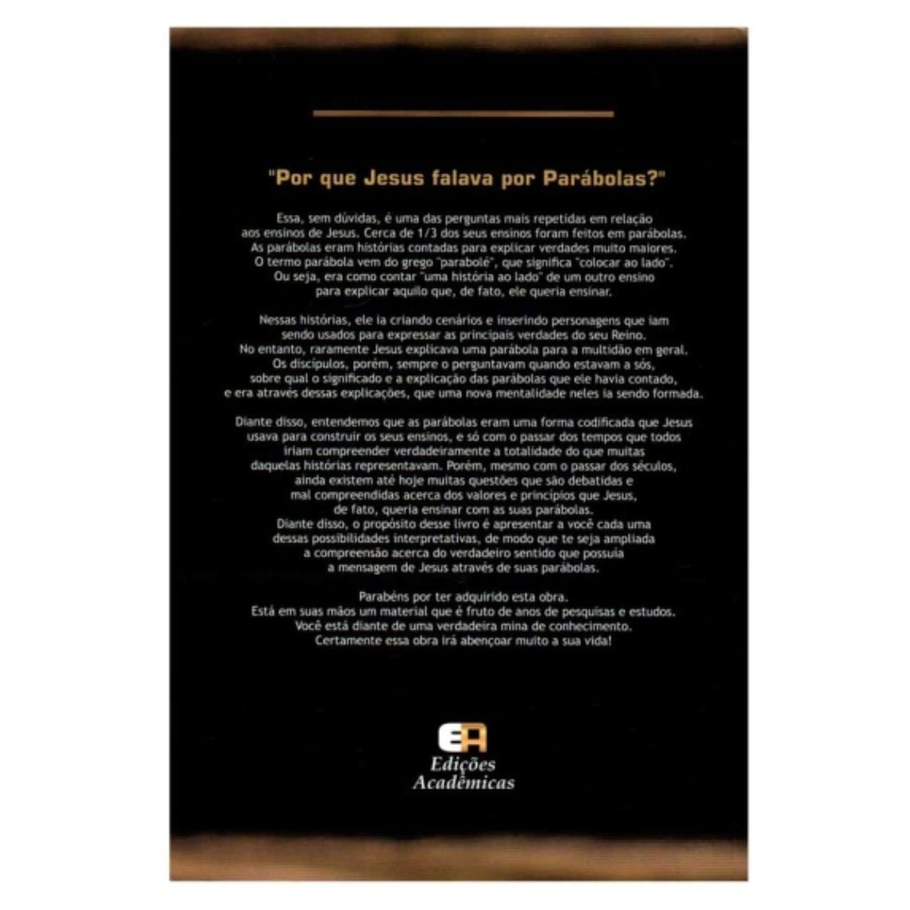 Manual Bíblico Expositivo Sobre As Parábolas De Jesus Uma Exposição Exegética, Interpretativa e Cultural sobre as 42 Parábolas contadas por Jesus . "Por que Jesus falava por Parábolas?" Essa, sem dúvidas, é uma das perguntas mais repetidas em relação aos ensinos de Jesus. Cerca de 1/3 dos seus ensinos foram feitos em parábolas. As parábolas eram histórias contadas para explicar verdades muito maiores. O termo parábola vem do grego "parabolé", que significa "colocar ao lado" ou seja, era como contar "uma história ao lado" de um outro ensino para explicar aquilo que, de fato, ele queria ensinar. Detalhes do Produto : Autor: Pr. Matheus Soares Editora: Edições Acadêmicas Dimensões: 16 larg. x 23 alt. Número de Páginas: 304