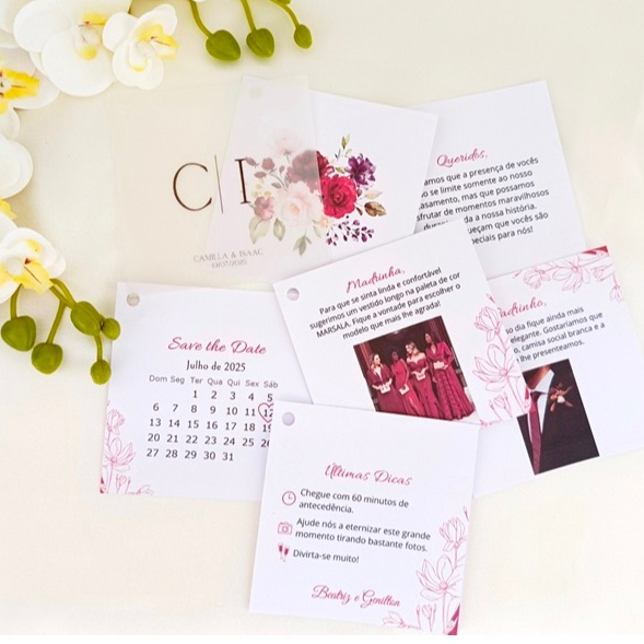 Queridos Noivinhos, Sabemos que esse momento é muito importante e especial na vida de vocês, por isso vale a pena investir em eternizar o Grande Dia! Após a compra informar no chat do vendedor as seguintes informações: *Nome dos Noivos; *A data do Grande Dia; *Trajes dos padrinhos e madrinhas; *Finalização em ilhós ou laço cetim. Ah, esse manual será uma linda lembrança de que seus amigos fizeram parte desse momento na vida de vocês! Detalhes importantes do nosso modelo básico: - Os manuais são feitos em papel branco 180g - Tamanho: 9,5 x 9,5cm ou 7,5x10cm - Vem com um lindo laço de fita de cetim na cor tema do casamento ou com ilhós. - Cada manual contém 6 cartões -1 capa em papel vegetal ATENÇÃO: Não trabalhamos com impressão de arte própria do cliente. Não encontrou a quantidade que precisa? Gostou do modelo, mas quer em outra cor? Ou ficou com alguma dúvida? Chama-nos no chat temos o maior prazer em atende-lo.