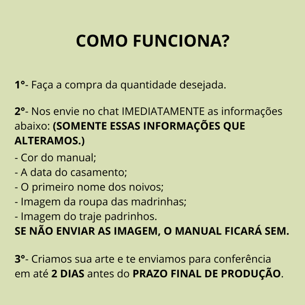 Surpreenda seus Padrinhos de Casamento com um Manual de Padrinhos elegante, delicado, cheio de amor. O que você receberá: - Manuais em Papel offset 180g liso branco fosco com 6 folhinhas; - Fechamento em ilhós prata. 📏 Tamanho do Manual: aproximadamente 9x9cm 🎨 Após a compra, envie IMEDIATAMENTE no CHAT: - A cor do Manual; - A data do casamento; - O primeiro nome dos noivos; - 1 Imagem de Inspiração da roupa das madrinhas;(Caso não nos envie, ficará sem imagem) - 1 Imagem de Inspiração da roupa dos padrinhos.(Caso não nos envie, ficará sem imagem) 🛑ATENÇÃO AOS PRAZOS ✅ PRAZO DE ENVIO DA ARTE: Sua arte será enviada para conferência de 24 horas a 48 horas, antes do prazo final da postagem, fique atenta ao chat. ✅ PRAZO DE POSTAGEM: Veja direto no carrinho, antes da finalização da compra. NÃO ANTECIPAMOS, porque nossa demanda é alta. ✅ PRAZO DE RECEBIMENTO: terá também o prazo de envio pelos Correios ou transportadora, NÃO TEMOS COMO SABER EM QUE DATA CHEGARÁ por isso, compre com antecedência. *As cores dos manuais podem variar de acordo com o monitor tanto do computador, quanto do celular e também de acordo com iluminação presente no momento da foto e calibração intensidade de cor das telas. NÃO ACHOU A QUANTIDADE DESEJADA? Nos chame no Chat. ❓Dúvidas? Nos chame no Chat.