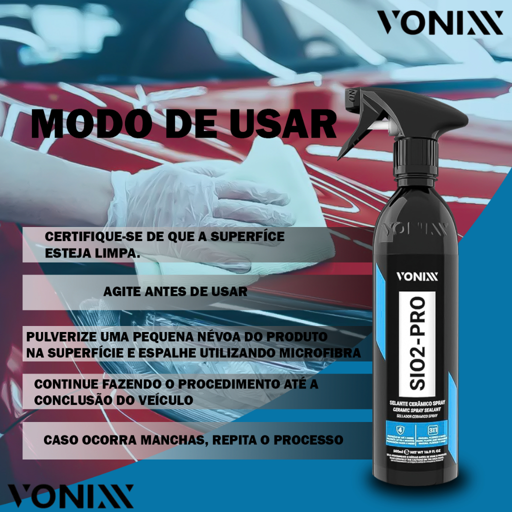 SIO2 PRO 500ML VONIXX - Manunteção de Vitrificação Automotiva Os vitrificadores a base de silício protegem a pintura do carro por muito tempo. Maior poder hidrofóbico; Melhor acabamento; Mais brilho por até 3 meses. Os vitrificadores a base de silício protegem a pintura do carro por muito tempo e tem várias características espetaculares, porém, o produto tem o mesmo toque de um vidro, ou seja, a superfície não fica com o toque aveludado como o deixado pelas ceras e selantes. Em virtude disso, desenvolvemos SiO2-PRO, um produto exclusivo, desenvolvido especialmente para manutenção de superfícies tratadas por vitrificadores. O produto poderá ser utilizado a cada 30 ou 45 dias na manutenção de superfícies que foram tratadas com V-Plastic (plásticos), V-light (faróis e lanternas) e V-Paint (pintura). Sua formulação balanceada, contém silanos e siloxanos de cadeia longa, que são polímeros derivados do elemento químico silício. Essa composição, promove uma incrível hidrorepelencia, e melhora significativamente o acabamento dessas superfícies. O produto deixa um toque aveludado e reduz consideravelmente o coeficiente de atrito, diminuindo as chances de riscos nessas superfícies, além de prolongar a vida útil das superfícies vitrificadas. MODO DE USAR: 1- Certifique-se que a superfície esteja limpa e seca; 2- Agite bem o produto antes de usar; 3- Pulverize uma pequena névoa do produto na superfície em uma área máxima de 60cm x 60cm e faça acabamento utilizando uma Toalha de Microfibra Vonixx limpa e seca virando-a frequentemente até obter o resultado desejado; Continue fazendo o procedimento até a conclusão total do veículo. 4- Caso ocorra manchas, repita o procedimento número 3.