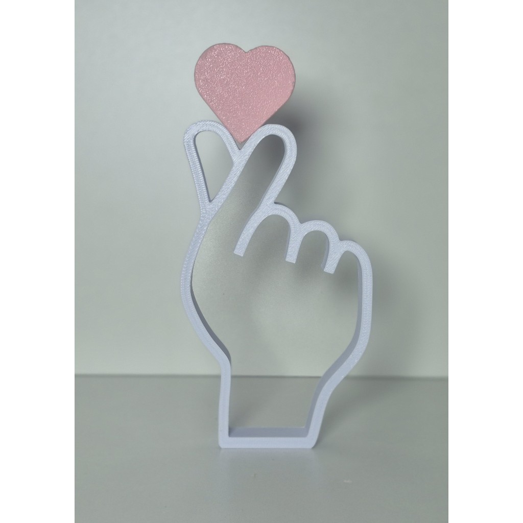 Ideal para presente, decoração de nichos e estantes ,deixe o ambiente mais encantador com essa linda escultura 3D da "mão coreana com coração", símbolo popular de carinho e afeto! Destaques do Produto: Design moderno e minimalista Feito em impressão 3D com acabamento detalhado Tamanho ALTURA: 12 cm x LARGURA: 4,5 cm e EXPESSURA: 1 cm. Material: PLA (Plástico Biodegradável) Esse produto foi feito através de uma impressora 3D com PLA, um plástico biodegradável que não agride o meio ambiente e finalizado de forma artesanal. • As peças podem sofrer alteração caso sejam expostas a altas temperatura ou diretamente ao sol por longo períodos. • As peças podem ser lavadas com sabonetes, detergentes, ou produtos similares, caso não sejam pintadas. • Evitar contato com cremes, pomadas ou produtos similares. • Não garantimos quebra, arranhões, desgastes naturais pelo uso ou manchas por alguma das substâncias citadas acima. • As peças são resistentes a água, caso não sejam pintadas. • Para limpeza de peças pintadas utilizar um pano seco.