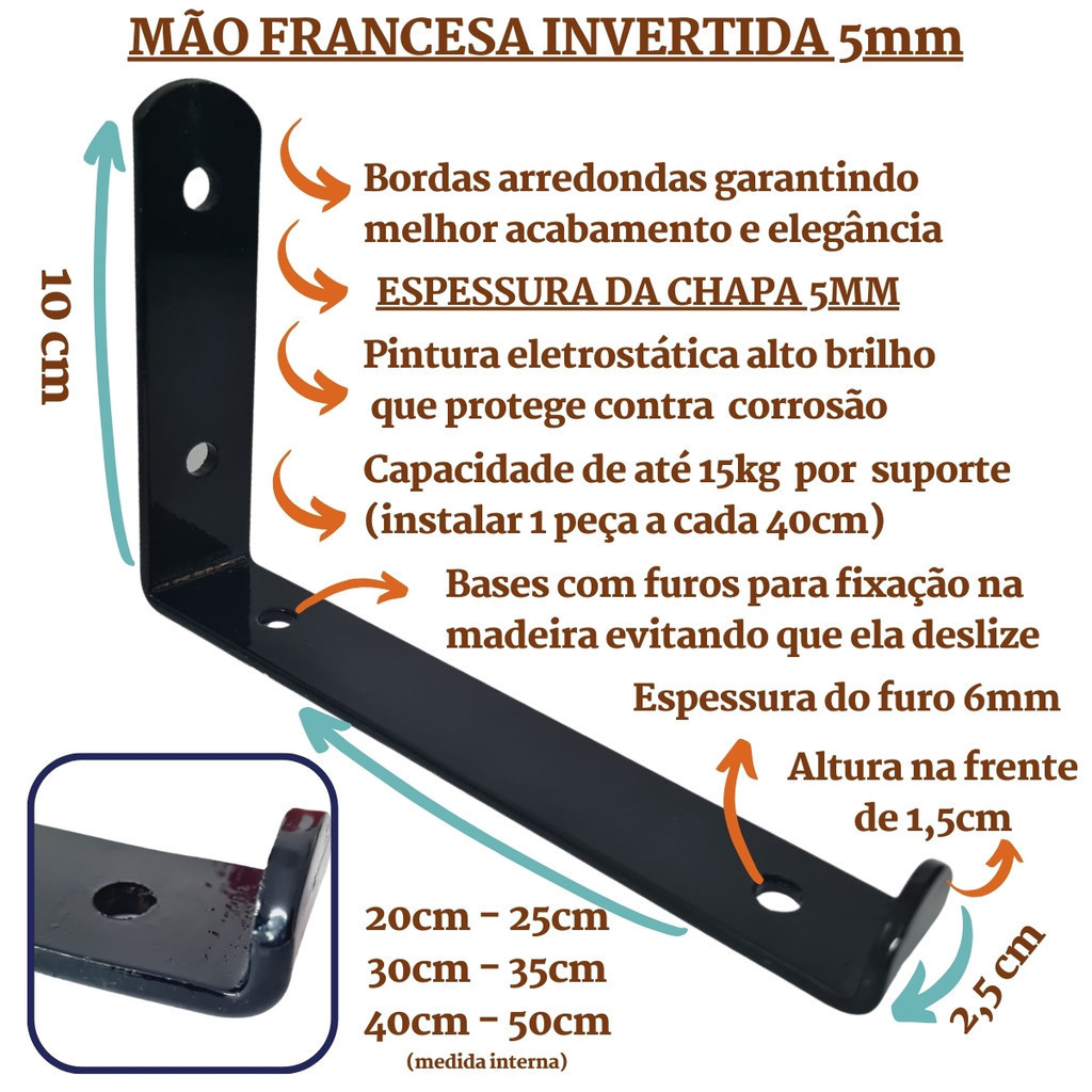 A mão francesa invertida é versátil e requintada. Tem ganhado destaque na decoração de ambientes no estilo industrial. Com vários tamanhos disponíveis, esse suporte garante praticidade e estilo na instalação das prateleiras. Feitas de ferro, você mesmo pode instalar as cantoneiras. Conteúdo da embalagem: • 2un Mão francesa • 4un Parafusos Philips (para serem instalados na parede) • 4un Buchas de Nylon (para serem instaladas na parede) • 4un Parafusos Philips (para serem instalados na madeira) Especificações técnicas: - Suporta até 10kg por cantoneira (20kg o par), respeitando o espaçamento máximo de 40cm entre as mãos francesas. - O modelo reforçado 5mm suporta até 15kg por cantoneira (30kg o par), respeitando o espaçamento máximo de 40cm entre as mãos francesas. - Fabricado em aço carbono, resistente e durável. - Pintura eletrostática na cor preta, garantindo alta resistência, melhor acabamento e uniformidade; - Garantia 3 meses contra defeitos de fabricação. - Design tradicional e discreto ideal para qualquer tipo de ambiente. Possui furos para fixação na parede e no objeto que se irá apoiar. Perguntas frequentes: - Acompanha buchas e parafusos? Sim - O tamanho do suporte é igual ao anunciado? Sim - Qual a distância ideal entre as mãos francesas? Recomenda-se instalar com a distância máxima de 40 cm entre as mãos francesas, para garantir uma melhor sustentabilidade. - Qual a distância ideal entre uma prateleira e outra? Para acomodar objetos grandes é necessário que haja uma distância de 50 a 60 cm. - Posso instalar o produto em Gesso e Drywall? Se a parede for de drywall ou gesso, é necessário um reforço estrutural no local, além de buchas especiais. Utilize cargas baixas, de preferência 2 kg por ponto de fixação. - Qual tamanho ideal da prateleira? No geral, prateleiras com 35 cm de profundidade tendem a comportar todos os tipos de livros (inclusive de artes e fotografia, por exemplo). Prateleiras estreitas, de 20 cm, comportam livros de leitura. O ideal é que, caso você tenha muitos livros grandes, meça-os para ter certeza da profundidade da prateleira. - Qual a altura ideal para instalar a prateleira? Com a ajuda de uma trena, meça a altura que a prateleira deve ficar. A altura indicada é diante dos olhos, ou seja, não tão alto e nem tão baixo. As medidas padrões para instalar prateleiras são entre 1,65mts e 1,75mts a partir do chão. - De onde surgiu o nome mão francesa? O nome mão francesa, como o próprio nome já lembra, surgiu na França quando lá foi desenvolvida um tipo de cantoneira que tinha o formato de uma mão espalmada para apoiar principalmente vasos de plantas. Sobre a empresa: Atuando no mercado desde 2020, a maofrancesa foca seu trabalho em trazer para o mercado nacional produtos exclusivos de jardinagem e organização do lar. Ideias para organizar os ambientes: Instalar prateleiras para formar uma dispensa na cozinha, ou guardar produtos de limpeza na lavanderia. Organizar brinquedos infantis no quarto e produtos de uso diário, como lenços umedecidos, fraldas etc. Organizar livros, porta-retratos, objetos decorativos etc. Como instalar mão francesa? Antes de começar, garanta que não haja tubos de água ou cabos elétricos no local onde a prateleira será instalada. Se a parede for de drywall ou gesso, é necessário um reforço estrutural no local, além de buchas especiais. Utilize cargas baixas, de preferência 2 kg por ponto de fixação. Posicione a prateleira na parede usando o nível para conferir a posição. Utilize o lápis para riscar toda a extensão onde a prateleira ficará e faça as furações das mãos francesas nas paredes com o lápis, mantendo a distância adequada entre elas. Use a furadeira para fazer os furos nos locais marcados e insira as buchas em cada um deles com a ajuda de um martelo, se for necessário. Depois, afixe as mãos francesas com uma chave de fenda e posicione a prateleira sobre essas peças com a ajuda de parafusos.