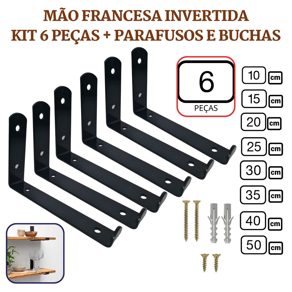 Mão Francesa Invertida 6 Peças Preta Prateleira Industrial Cantoneira Invisível Suporte Microondas com Parafusos para Instalação