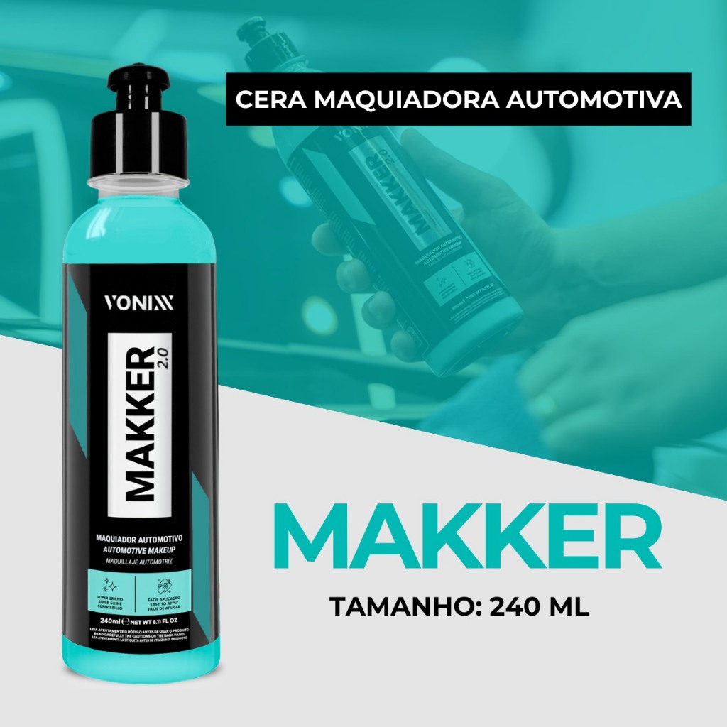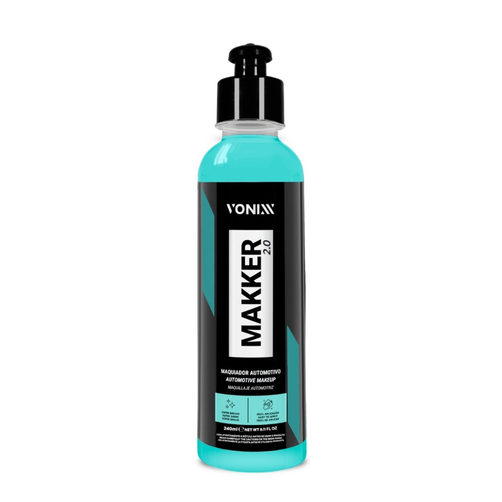 MAKKER 2.0 é uma maquiagem automotiva desenvolvida exclusivamente para preencher pequenos defeitos e renovar pinturas queimadas ou desbotadas. Pode também ser utilizado para alcançar brilho máximo na pintura. Além de maquiar, o produto deixa um toque extremamente liso e garante proteção de até 90 dias. NOTA: Como o produto possui microabrasivos especiais, também é capaz de corrigir defeitos leves se utilizado com aplicador de microfibra ou com máquina. Tamanho: 240ML DILUIÇÃO - Pronto uso. DURABILIDADE - Até 30 dias após a aplicação BENEFÍCIOS - Super Brilho - Fácil Aplicação MODO DE USO: 1. Agite bem o produto antes de usar. 2. Aplique uma pequena quantidade do produto em um aplicador de espuma ou microfibra. 3. Espalhe o produto na pintura, realizando movimentos uniformes e circulares. 4. Aguarde secar por, no mínimo, 5 minutos. 5. Remova o excesso de produto com uma toalha de microfibra até obter o brilho desejado.