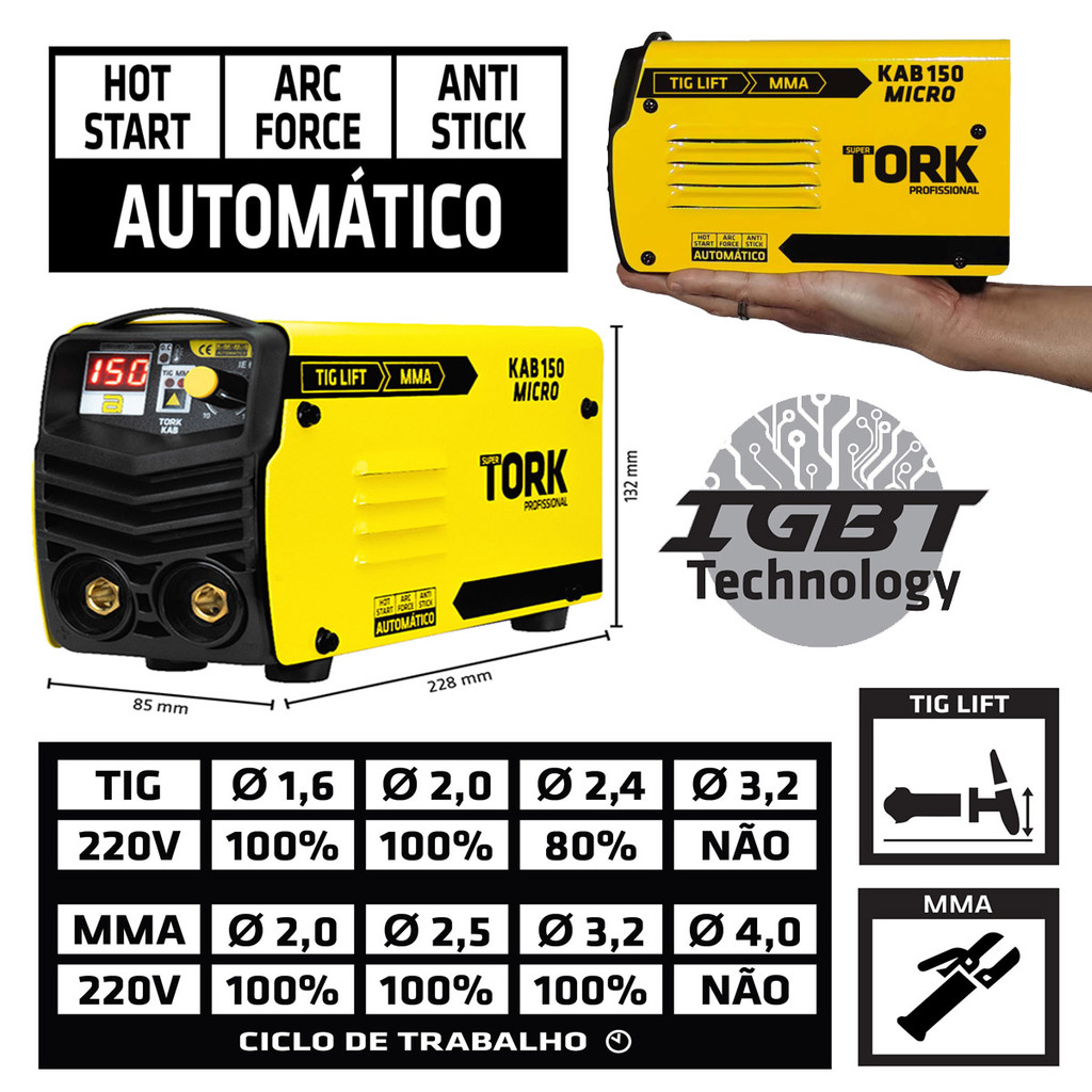 Máquina de Solda Inversora Kab150 Micro MMA e TIG LIFT Tork A MELHOR TECNOLOGIA DE SOLDA DO MUNDO EM SUAS MÃOS! O inversor de solda IE-6150-220V Super Tork Profissional foi projetado com intuito de modernizar e facilitar os trabalhos de solda. Produto combinado 2X1 a fonte de solda tem a capacidade de realizar 2 processos de soldagem como TIG-LIFT e MMA. Com placa eletrônica construída em base SMD (montagem robótica) e inserção de componentes de alta qualidade a fonte de solda possui longa vida útil e baixo nível de manutenções. Com tecnologia IGBT aplicada em seu bloco de potência, a fonte de solda proporciona uma potente corrente de solda e baixo consumo de energia elétrica. Em sua construção eletrônica, dispositivos térmicos de proteção e cooler de alta capacidade de refrigeração aumentam seu ciclo de trabalho, segurança e produtividade em conjunto. Os inversores SUPER TORK foram projetados para tornar o seu trabalho mais rápido e fácil. As prioridades ao projetar esta máquina foram para facilitar a operação e manutenção, além de oferecer segurança, conforto e confiabilidade. - Função MMA Eletrodo Revestido; - Função TIG-LIFT (Possibilita a solda de chapas finas e proporciona melhor acabamento) tocha não inclusa; - Solda todos os tipos de eletrodos, tais como: E6013, E7018, alumínio, inox e ferro fundido; - Alta capacidade de solda e ótimo ciclo de trabalho; - HOT-START MMA (Facilidade de abertura de arco elétrico com vários tipos e diâmetros de eletrodos); - ARC-FORCE MMA (Controle de estabilidade de arco inteligente, mantem o arco balanceado com corrente + tensão); - ANTI-STICKING MMA (Desabilita a corrente de solda quando eletrodo gruda, fácil remoção e segurança na solda); - Tecnologia IGBT, potente corrente de solda e baixo consumo de energia elétrica; - Indicador de proteção térmica (Segurança e inteligência); - Display Digital (Facilidade e precisão de ajuste); - Turbo ventilada (alta eficiência de refrigeração); - Com alça de transporte (Leve e portátil, de fácil locomoção); CICLO DE TRABALHO MMA - ELETRODO REVESTIDO - Eletrodo 2,0mm - 100% - Eletrodo 2,5mm - 100% - Eletrodo 3,2mm - 100% CICLO DE TRABALHO TIG-LIFT - Tungstênio - 1.6 - 100% - Tungstênio - 2.0 - 100% - Tungstênio - 2.4 - 80% Acessórios Incluso: - 1 Porta eletrodo, - 1 Garra do terra - 1 Alça de transporte; - 1 Manual de instruções - 1 Guia rápido Referencia: 5023 - Código: IE-6150-220V - Marca: Super Tork - Potência: 4.800w - Frequência: 60hz - Voltagem: 220v - Ligação: Tomada (20A) já instalada - Corrente de entrada eficiente: 18A - Tensão no Vazio: 73V - Amperagem mínima: 10A - Amperagem máxima: 150A - Diâmetro do eletrodo: 2,0 ~ 3,2mm - Conector: 9mm - Hot Start: Automático - Arc Force: Automático - Anti Stick: Automático Dimensões Aproximadas do Produto: - Altura: 132mm - Largura: 85mm - Comprimento: 208mm - Peso: 1.850Kg *** DÚVIDAS FREQUENTES: *** Qual a garantia? - Seu inversor possui 02 (DOIS) anos de garantia contra vícios de fabricação, sendo 9 de meses garantia contratual + 3 meses de garantia legal + 12 meses de garantia adicional. Para garantia adicional, basta fazer o preenchimento do formulário no site do fabricante, você ganhará 12 meses adicionais à garantia contratual! Quais materiais conseguimos soldar com este equipamento? - MMA ? ELETRODOS REVESTIDOS: Aço Carbono, Aço Inox, Ferro Fundido, Alumínio, Metalon, Perfil Metálico, Chapas Automotivas, Carrocerias, Estruturas metálicas entre outros materiais ferrosos! - TIG DC: Aço Carbono, Aço Inox, Ferro Fundido, Metalon, Perfil Metálico, Chapas Automotivas, Carrocerias, Estruturas metálicas entre outros materiais ferrosos! Qual a vantagem de soldar com o processo MMA eletrodo revestido? - O eletrodo revestido é considerado o processo mais versátil, pois solda qualquer material. - São facilmente encontrados no mercado, possuem um valor acessível e não requer habilidades avançadas em soldagem. - No processo MMA ? ELETRODO REVESTIDO o único consumível é o próprio eletrodo. Qual a vantagem de soldar com o processo TIG? - O processo TIG (ALTA FREQUENCIA ou LIFT) é considerado o processo para melhor acabamento. - Devido ao seu estilo de soldagem o processo TIG garante uma excelente fusão dos materiais com belíssimo resultado final. - O processo TIG proporciona resultados mais limpos, sem respingos, sem escoria e sem a necessidade de retrabalhos como lixas ou passes. - No processo TIG é necessário ter: Vareta de adição TIG, Eletrodo de Tungstênio, Cilindro de Gás, Regulador de Gás e Tocha TIG completa.