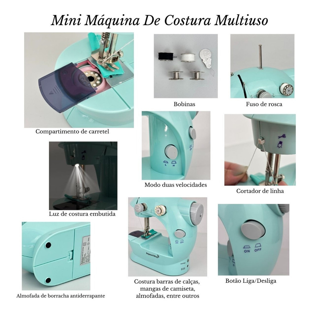 A mini máquina de costura ImportWay oferece uma experiência nova e prática para as costuras do seu dia a dia, você poderá realizar pequenos trabalhos como por exemplo: ajustes, entre outras opções. Com seu tamanho compacto permite um fácil manuseio e transporte nas atividades do seu dia a dia. Especificações: • Marca: ImportWay • Modelo: IWMC507AZ • Para trabalhos simples do dia-a-dia • Costura barras de calças, mangas de camiseta, almofadas, entre outros • Possui sistema de iluminação • Tem pedal de controle • Voltagem bivolt: 127/220V • Opção de alimentação 4 pilhas AA • 2 opções de velocidade • Produto certificado pelo INMETRO Conteúdo da Embalagem: - 01 Mini Máquina Costura Azul Portátil Bivolt 2 Velocidade ImportWay "Compra Garantida" - Ao Comprar conosco a sua compra é 100% garantida, o seu dinheiro está seguro até a entrega. *Garantia 90 dias. *Imagens meramente ilustrativas