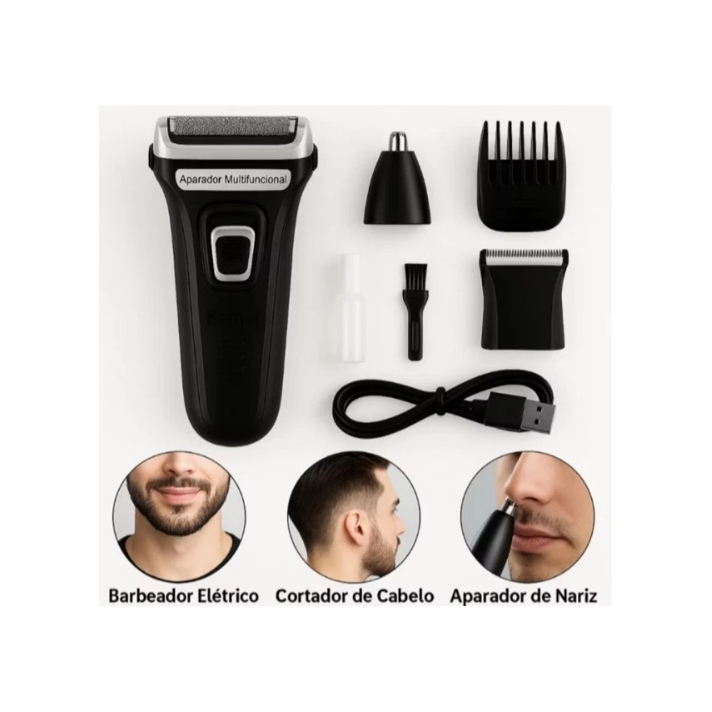 Máquina de Cortar Cabelo, Barbeador Elétrico, Aparador de Pelos, Recarregável, Bivolt, Kemei KM 3 x 1 Modelo aerodinâmico e design ergonômico, este produto é uma máquina de cortar cabelo, barbeador e aparador de pelos recarregável. O barbeador possui duas cabeças de corte flutuantes, com sistema de ação individual. -MODO DE USO. - A cabeça shaver é ideal para pessoas que tenham alergia a lâmina da Gillette ou a navalha, que é um método muito agressivo, com o shaver não vai causar essa irritação. - Lembrando que antes de usar o shaver é necessário passar uma máquina zero para cortar os pelos, depois vem o shaver. Ele não deve ser utilizado em pelos grandes. - Após raspar os pelos na zero, com a parte de cortar cabelo. Você usará o shaver a parte que tem duas lâminas para poder aparar os pelos e deixar liso como se fosse gillete. - Para efetuar a troca das cabeças do barbeador elétrico, basta girar a cabeça, no sentido ANTI-HORÁRIO, e para encaixa-lo novamente girando no sentido HORÁRIO. - Para recarregar deixe por 8 horas (Recomendado pelo fabricante). - Mantenha as lâminas sempre lubrificadas. - Alguma dúvida no uso do aparelho estou a disposição, utilize o campo de perguntas. Características: - Marca: Kemei - Modelo Número: KM-6558 - Alimentação: Recarregável - Característica: Lâmina dupla - Utilização: Corpo, Barba, Bigode, Cabelo - Tempo de uso: Até 60 Minutos - Tempo de Carga: 8 horas - Voltagem: Bivolt (100 - 240V) - Potencia nominal: 3W - Material: ABS + Stainless Steel - Tamanho: 16,5 cm x 6,5 cm - Tipo de Item: Barbeador Elétrico, Aparador de Pelos e Cortador de Cabelos Itens Inclusos: 1 Maquina Kemei KM-6558 1 Cabo de carregamento 1 Pincel de limpeza 1 Cabeça para barbear 1 Cabeça aparador de pelos de Nariz 1 Cabeça cortador de cabelo