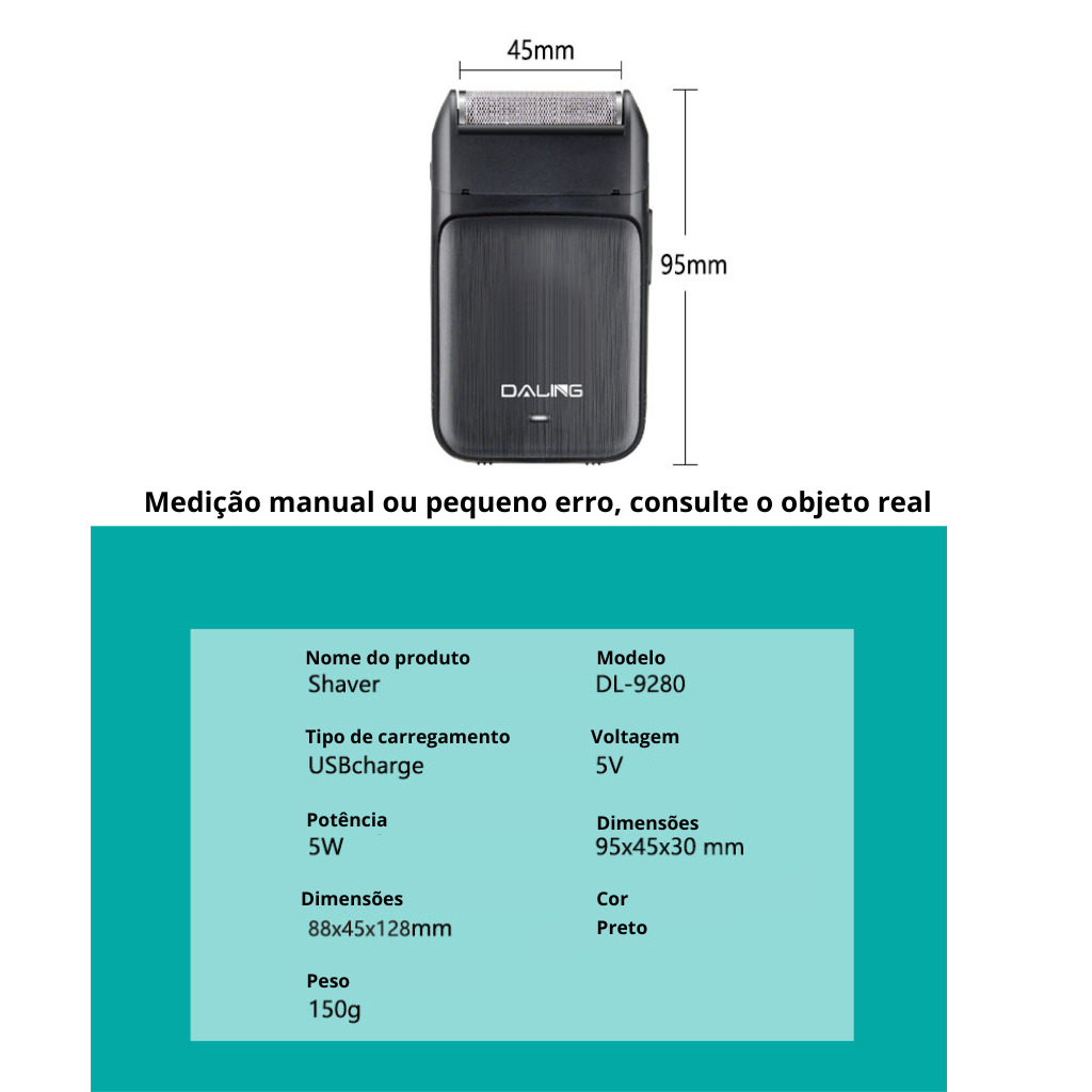 Maquina de Barbear Barbeador Lâmina Elétrico Daling Recarregável Bivolt 1- Tempo de carregamento: É altamente recomendável carregar pelo menos 8 horas pela primeira vez para garantir o melhor desempenho do produto. Para carregamento posterior, siga as instruções para o tempo necessário para carregar totalmente a máquina 2-Carregador: utilize apenas um carregador normal de 2.0 até 3.0A para evitar danos à bateria e prolongar sua vida útil. Não use carregadores turbo, pois eles podem causar superaquecimento e danificar o produto. 3-Uso em pelos grossos: antes de utilizar a máquina em pelos muito grossos, é recomendado passar uma lâmina para obter um melhor resultado. Isso ajudará a evitar puxões e garantir um barbear mais suave e eficaz. ----------------------------------------------------------------------------------------- Especificações Técnicas: Tipo de lâmina: Titânio Funções: Cabeça flutuante, barbear a seco, barbear molhado, lavagem subaquática, carga rápida, indicador de carga Tipo de bocal: Ajustável Tamanho: 95x45x60mm Material: Sistema de freio antibloqueio Voltagem: Universal (100-240V) Tempo de carga: 2 horas Com dispositivo de retoque: Sim Método de limpeza: Não lave Tempo de uso: 120 minutos Recursos adicionais: Tipo de lâmina: Simples, dupla, tripla, quádrupla, quíntupla Tipo de fonte de energia: Recarregável / Elétrico Gênero: Masculino Bateria: 600mAh bateria de lítio Ajuste de velocidade: Três velocidades ajustáveis Velocidade de rotação: 6000/6500/7000 rpm Voltagem: 110-240V Carregador: Carregador USB 5W Tela de exibição: Exibição de energia / Exibição de carga / Exibição de velocidade do motor ----------------------------------------------------------------------------------------- Itens Inclusos: 1x aparador de barba elétrico 1x cabo de carregamento(usb) 1x escova de limpeza