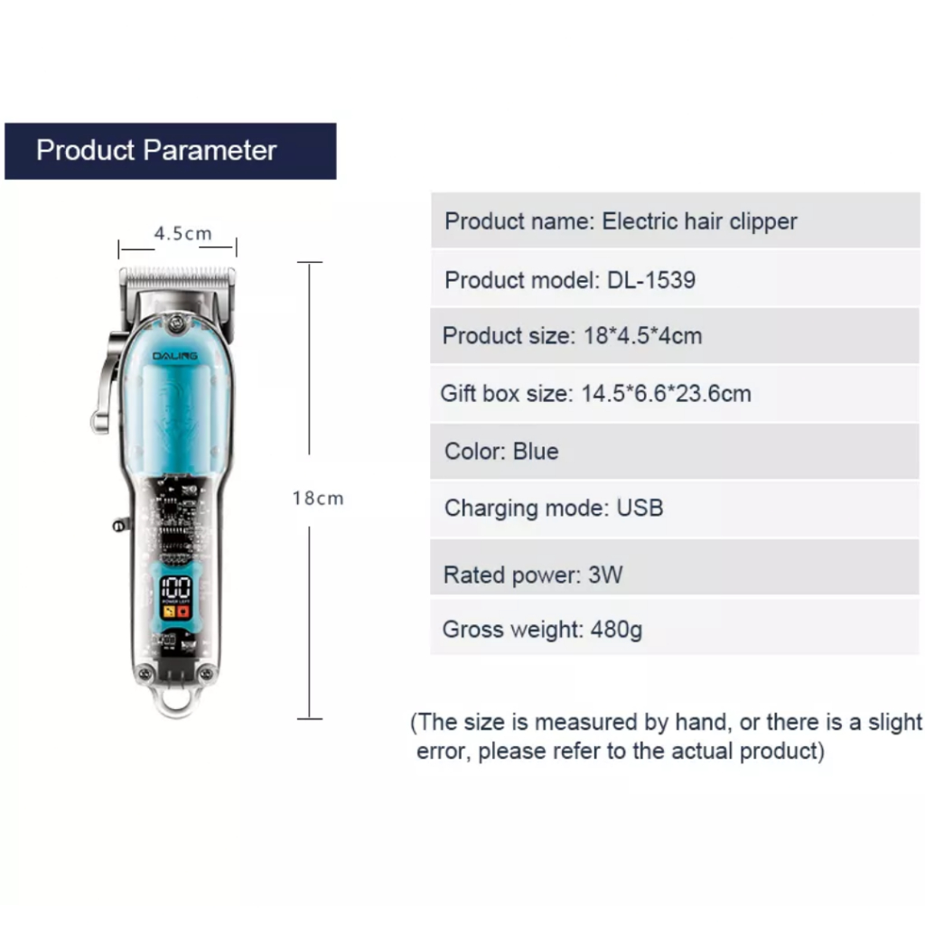 MODELO: MODELO DL-1539 -- Máquina de corte de pelos do corpo totalmente transparente e visível daling novo aparador de barbear sem fio Material da lâmina: aço inoxidável totalmente transparente e visível para um bom trabalho de corte, dando aderência e eficácia na hora do corte aparador sem fio aparador de cabelo e barba, equipamento profissional de corte de cabelo Aplicação: Exterior, Comercial, Doméstico Fonte de energia: usb, elétrica Tempo de execução máximo:?90min Fonte de alimentação: Elétrica Nome da marca: DALING Nome do produto: Máquinas de cortar cabelo elétricas Tamanho do produto: 18*4,5*4 Tempo de carregamento: 3 horas Tempo de trabalho: 180 min Tempo de trabalho Cor azul Embalagem: Caixa Colorida Importante (Deixe carregar por 8 horas antes do uso, elas são testadas por horas antes do envio e pode chegar descarregada)