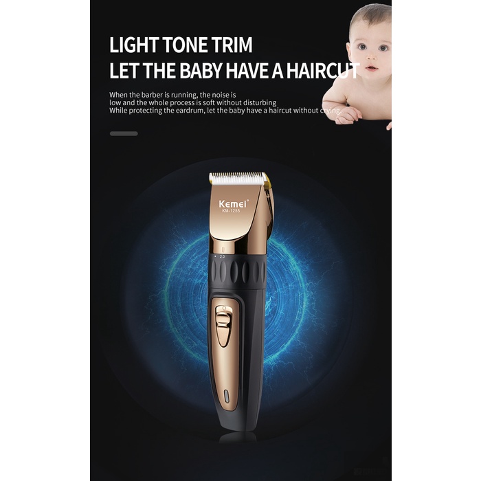 Lâmina de cerâmica para fornecer desempenho de barbear suave, rápido e preciso. O design curvo da borda evita lesões na pele. A cabeça de cortador destacável pode ser limpa diretamente sob a torneira. A lâmina de cerâmica não ficará quente Nome da marca: kemei Tipo de energia: Recarregável Uso: cabelo, loja de barbeiro Tempo de uso: 40 minutos Tempo de carregamento: 2 horas Voltagem: 100-240v Número do modelo: KM-1255 Motor: muito poderoso Cor: como a imagem na página do produto mostra Material: ABS Característica: Ferramenta de barbeiro profissional, ou uso doméstico 4 guias de corte Carregamento rápido e forte poder Incluído no Pacote: 1 x aparador de cabelo 1 x Cabo de Carga 1 x escova de limpeza 1 x Manual 4 x pentes de limite