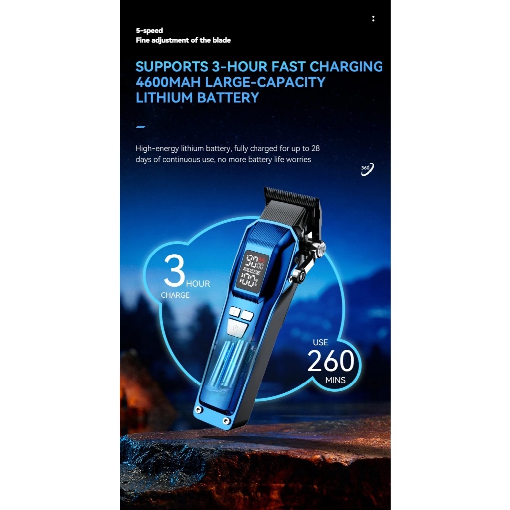 oltagem: 110v / 220v = Bivolt Potência: 10w Recarga: 3h Uso: 4h Botão de ajuste RPM: De 7.000 á 9.000 Itens na caixa: 1x lâmina extra 1x protetor de lâmina 10x pentes ( 1.5mm / 3mm / 4.5mm / 6mm / 9mm / 12mm / 15mm / 18mm / 21mm / 24mm) 1x Cabo carregador USB-C 1X Pincel para Limpeza Características da introdução ★Motor sem escova: A incorporação de um motor sem escova garante desempenho superior e Durabilidade da durabilidade. Este design do motor reduz o atrito e o desgaste, garantindo um Vida útil mais longa para o cortador de cabelo. ★Rotação variável de 5 velocidades: Este cortador de cabelo possui um sistema de rotação ajustável de 5 velocidades, permitindo Usuários de usuários para escolher entre várias configurações de RPM para se adequar a diferentes tipos de cabelo Necessidades de corte e necessidades de corte. A velocidade mais alta atinge até 9000RPM, garantindo Corte de cabelo suave e eficiente. ★Alavanca de ajuste de ajuste de ajuste fino de 5 níveis de nível: Equipado com uma alavanca de ajuste de ajuste de ajuste fino de 5 níveis, o cortador de cabelo oferece Controle preciso preciso do controle preciso sobre o comprimento de corte, permitindo que os usuários alcancem o Penteado desejado com facilidade para penteado desejado. ★Bateria de alta capacidade de 4600mAh Bateria de alta capacidade: Alimentado por uma bateria de grande capacidade de 4600mAh, este cortador de cabelo oferece estendido Tempo de execução dos usuários, permitindo que os usuários desfrutem de vários cortes de cabelo sem a necessidade de Recarga frequente. ★Lâminas de metalurgia em pó revestidas a DLC em pó revestidas a DLC: O cortador de cabelo possui lâminas de metalurgia em pó revestidas de DLC, que são A corrosão é extremamente durável e resiste à corrosão. O revestimento DLC também melhora Dureza e desempenho de corte das lâminas das lâminas, garantindo uma dureza e corte suaves e Cortes de cabelo precisos.
