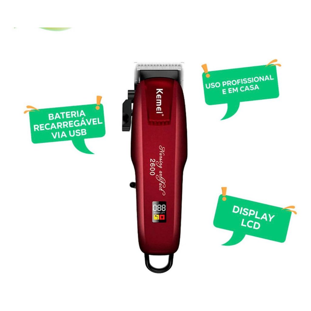 | Máquina de Cortar Cabelo Profissional KEMEI -2290 Portátil Usb Disp... | R$ 139,55 | 30% | 4.9/5 | 3 |