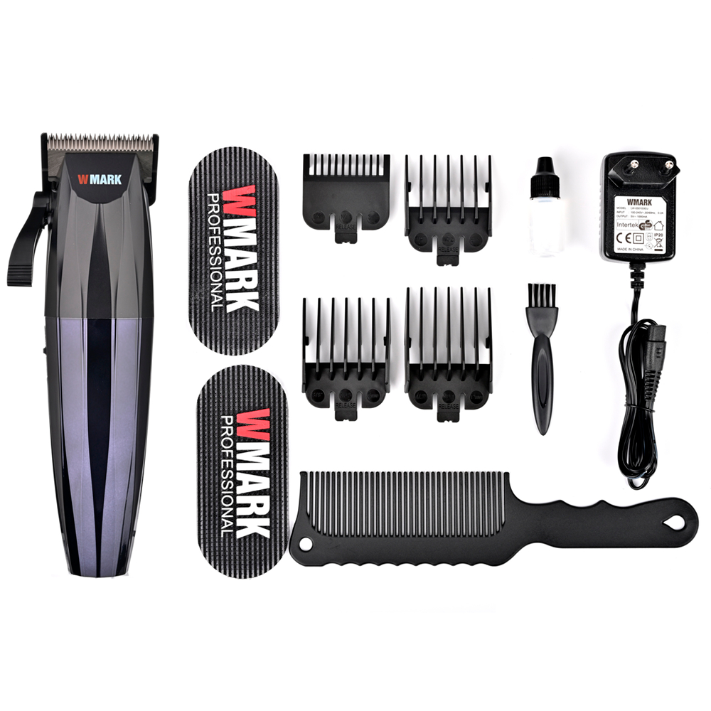 Bateria de Litio ( tempo de execução 180 minutos, tempo de carregamento 3 horas ); Lamina aço inoxidável de alto grau 440C (9CR18) COR:PRETO Bateria de litio: 2500mAh 3 horas de carga total Para 180 minutos de uso. Ajuste da lamina:(0.5/3.5mm) Lamina Fade Lamina móvel de Ceramina Lamina em forma de T Ultra Itens Inclusos: 1x Maquina Wmark Ng-222 1x Oleo lubrificante 1x Escova de limpeza 1x Carregador 4x Pentes guias ( 3/6/9/12mm) 1x Divisor de Cabelo