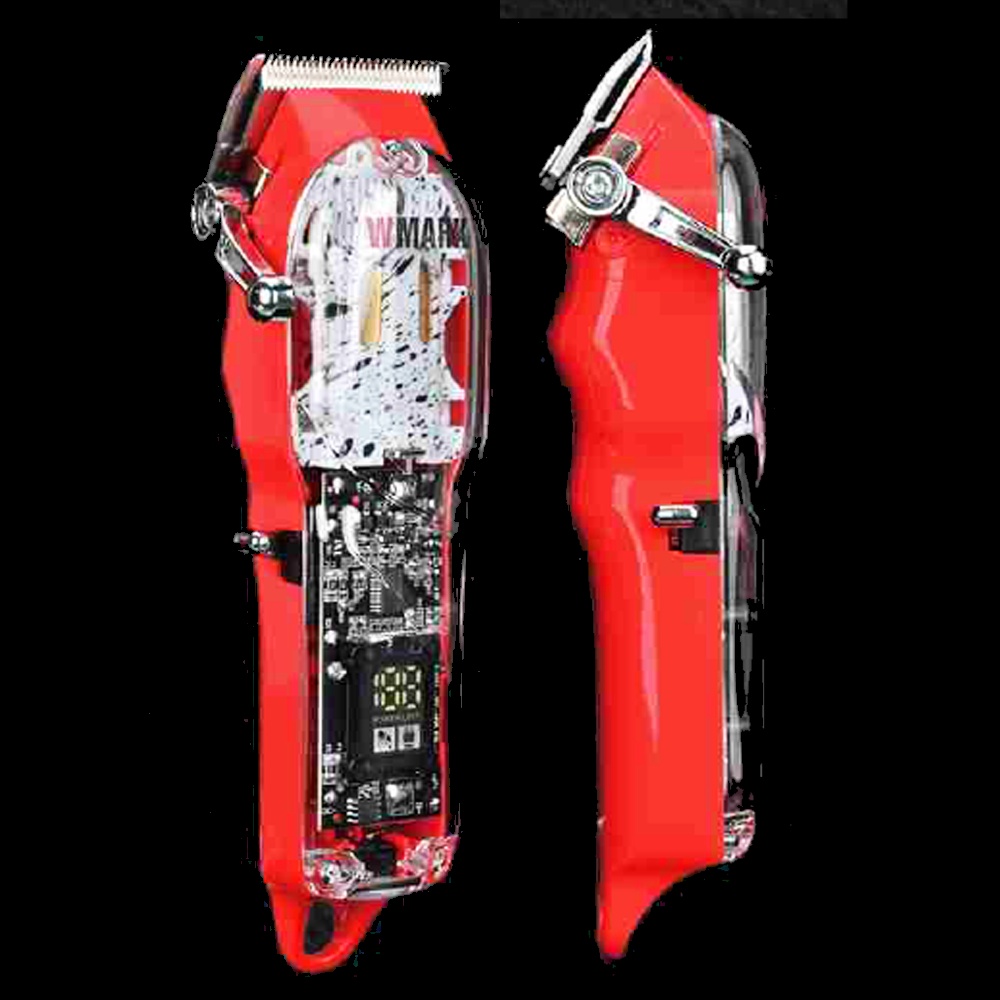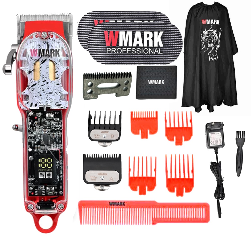 Maquina De Cortar Cabelo lamina inoxidavel Vazada Com Melhor Ventilacao Para Nao esquenta tanto Alavanca de ajuste da lamina de metal Lamina de aco inoxidavel de alta qualidade e precisao, pode ser ajustada para zero gap. Especificacoes: . Bateria de litio: 2600 mAh. . Chave liga / desliga de metal e alavanca de ajuste da lamina. . Velocidade do motor: 6500 RPM. . 3 horas de carga completa para 240 minutos de uso. Itens incluso: 1x Maquina de cortar cabelo 409 4x Pentes guia (3/6/9/12mm) Vermelho 2x Pentes guia premiun (1,5 4,5) Preto 1x Oleo lubrificante 1x Escova de limpeza, 1x Pente de cabelo Vermelho 1x Carregador 1x Lamina de Ceramica Preto 1x Grip de Borracha 1x Capa Estampa Grande Wmark Exclusivo