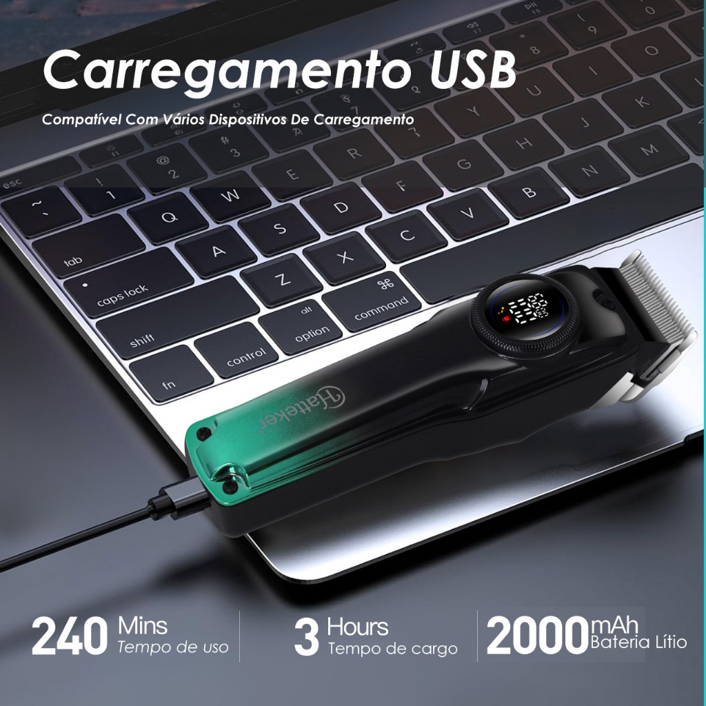 A Hatteker HT-6031 foi desenvolvida para quem busca desempenho confiável, longa duração de bateria e corte preciso. Com motor de alta velocidade, lâminas em aço inoxidável e carregamento USB Tipo-C, é ideal tanto para uso doméstico exigente quanto para profissionais iniciantes e barbeiros. Principais Benefícios Motor de alta velocidade com controle inteligente de pressão Entrega cortes rápidos e uniformes, mantendo desempenho estável mesmo em cabelos mais grossos. Lâminas em aço inoxidável 3Cr13 Corte preciso, durável e suave, reduzindo puxões e proporcionando acabamento limpo. Bateria de íon-lítio de alta capacidade (2000mAh) Até 240 minutos de uso contínuo, ideal para várias sessões sem recarga. Carregamento moderno USB Tipo-C Mais praticidade e compatibilidade com tomadas, computadores, notebooks e power banks. Sistema de proteção inteligente Proteção contra sobrecarga, descarga excessiva e travamento do motor, aumentando a vida útil do aparelho. Função Plug and Play Pode ser usada durante o carregamento, garantindo praticidade quando necessário. Design leve e ergonômico Fácil de manusear, confortável e com acabamento premium. Especificações Técnicas Marca: Hatteker Modelo: HT-6031 Potência: 5W Entrada: 5V ⎓ 1A Porta de carregamento: USB Type-C (cabo de 1 metro) Motor: 390PA-3850 ROHS – até 7000 RPM Velocidade média: 6800 RPM Nível de ruído: ≤78 dB Bateria: Íon-lítio 1865 – 2000mAh Tempo de carregamento: aproximadamente 3 horas Tempo de uso: até 240 minutos Lâmina fixa: Aço inoxidável 3Cr13 Lâmina móvel: Aço inoxidável 3Cr13 Material do corpo: ABS com pintura spray e eletrodeposição UV Dimensões do aparelho: 180 × 50 × 40 mm Peso do aparelho: 269 g Dimensões da embalagem: 11,5 × 7,2 × 22,5 cm Peso da embalagem: 625 g Conteúdo da Embalagem 1 Máquina de corte Hatteker HT-6031 1 Cabo USB Tipo-C 1 Escova de limpeza 1 Óleo lubrificante 4 Pentes guia (3mm, 6mm, 9mm, 12mm) 1 Manual do usuário (multilíngue) 1 Caixa colorida Por que escolher a Hatteker HT-6031? Alta autonomia para uso contínuo Corte preciso e eficiente com motor potente Proteções inteligentes que aumentam a durabilidade Carregamento moderno e versátil Excelente custo-benefício para uso doméstico ou profissional