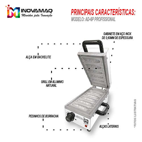 Máquina de crepe no palito INOVAMAQ modelo AD-6P Profissional para uso em buffet, lanchonetes, casas especializadas em crepes, festas e eventos em geral. Para você que procura pela melhor crepeira no palito, a INOVAMAQ é a sua melhor opção! AD-6P | Simplicidade, praticidade e robustez. Equipamento prático e robusto, sendo o melhor custo benefício do mercado, Equipamento de alta produção, capaz de Produzir 6 crepes no formato 4,5 x 13 cm, produção horária: 6 crepes a cada 5 minutos assando (Após 1º o aquecimento inicial de 15 Min), equipamento para uso EXCLUSIVO PROFISSIONAL, IDEAL P/: Buffet, Lanchonetes, casas especializadas em crepes, festas e eventos em geral. As máquinas de crepe no Palito CREPELITO 6 cavidades INOVAMAQ possuem estrutura em aço inoxidável 430 polido de alta qualidade. Equipada com 2 resistências tubulares de alta durabilidade e qualidade com 800 watts de potência cada, qualidade que proporcionam um aquecimento uniforme nos dois lados do grill. Sistema exclusivo de canaleta para coletar o produto em excesso. Excelente isolação térmica com lã de rocha e alças antitérmica. Grill em alumínio Natural (Revestimento de teflon consulte no menu acima) de alta qualidade com coletor nas bordas, exclusividade INOVAMAQ. Termostato de 50 a 300ºC e Luz piloto que indica aquecimento. Possui o 5º pesinho para melhorar a estabilidade do equipamento. Por que as máquinas de crepe no palito INOVAMAQ modelo AD-6P são as melhores ? São mais de 35 anos de experiência nesse tipo de equipamento, sem dúvidas a INOVAMAQ está muitos anos na frente em experiência, tecnologia e inovação. Todos os nossos produtos são desenvolvidos pensando na praticidade, segurança e funcionalidade, as máquinas de crepe no palito INOVAMAQ são robustas e podem ficar em uso o tempo que for necessário. Controlador de temperatura por termostato de 50 a 300ºC e luz piloto. Fabricadas com a melhor matéria prima e fino acabamento em corte laser, dobras e soldas perfeitas. Resistência elétrica tubular em aço inox com isolamento interno em lã de rocha. Como usar as máquinas de crepe no palito INOVAMAQ modelo AD-6P ? Pensando na praticidade do operador, as máquinas de crepe no palito INOVAMAQ são extremamente simples e de fácil operação, Termostato energiza a resistência do equipamento, a luz piloto indica resistência aquecendo. Qual tipo de recheios podem ser utilizados nas máquinas de crepe no palito INOVAMAQ modelo AD-6P ? Corte cubinhos na medida de 1x1cm de presunto e queijo, insira no palito de 20cm 4 cubinhos e deixe 1cm de palito sobrando na ponta, O palito ficará com 1x4cm de recheio, utilize também frutas como banana, morango, kiwi etc...Experimente utilizar chocolate do tipo batom (não precisa colocar o chocolate no palito somente em cima da massa, próximo do palito). Como fazer para que os crepes não grudem nos grills das máquinas de crepe no palito INOVAMAQ modelo AD-6P ? É normal os primeiros crepes no palito grudarem nas formas quando utilizado o equipamento com forma natural, o procedimento de fazer as placas ficarem antiaderente é muito simples, 1º aqueça o equipamento até a temperatura de 180ºC, 2º após desligar a luz piloto unte as placas (superior e inferior) com bastante margarina ou azeite utilizando um pincel de silicone para culinária (não incluso), após aplicar feche a placa e deixe “queimar” por 10 minutos, repita a operação mais 1x, pronto!!!, Outra dica extremamente importante é preparar a massa e o recheio na crepeira rapidamente, após fechar NÃO ESPIAR (abrir a placa) até passar o tempo de 4 a 5 minutos, após 4 minutos abra lentamente a placa e ajude o crepe descolar utilizando uma espátula. Como fazer pão de queijo no palito utilizando as máquinas de crepe no palito INOVAMAQ ? Quais são os modelos de máquinas de crepe no palito INOVAMAQ ? Trabalhamos com 3 Modelos diferentes de máquinas de crepe no palito INOVAMAQ: Modelos: AD-6P, AD-12P e AD-6G (BIG CREPÃO)