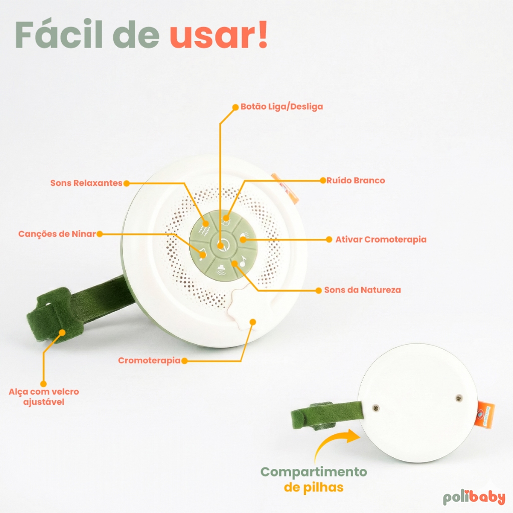 Som do Aconchego Polibaby - Música, Luz e Relaxamento para Bebês Tranquilidade, conforto e sono profundo em qualquer lugar. O Som do Aconchego Polibaby é uma máquina de som portátil que ajuda o bebê a relaxar e dormir melhor, combinando ruído branco, sons da natureza, batimentos cardíacos maternos e luzes suaves de cromoterapia. Oferece uma experiência sensorial completa que simula o ambiente uterino, promovendo acolhimento, regulação emocional e sono de qualidade desde os primeiros meses de vida. Ideal para uso em casa, no carrinho ou em viagens, é leve, seguro e prático para acompanhar a rotina do bebê. Características do produto Mais de 10 sons relaxantes: músicas de ninar, ruído branco, sons da natureza e batimentos cardíacos Cromoterapia com luzes suaves que induzem ao relaxamento Formato portátil com alça de velcro para fixação em qualquer lugar Volume ajustável para controle da intensidade sonora Botões emborrachados para segurança extra Simula a sensação de colo materno durante a transição para o berço Ideal para bebês desde o nascimento até a primeira infância Certificado pelo INMETRO Especificações Dimensões: 10 cm × 10 cm × 3,5 cm Material: PVC atóxico resistente a impactos Alimentação: 3 pilhas AA (não inclusas) Cor: off white com detalhes em verde Indicação: uso contínuo e seguro para a noite toda Itens inclusos 1 aparelho Som do Aconchego Manual de instruções Garantia e envio 90 dias de garantia contra defeitos de fabricação Devolução em até 7 dias após o recebimento Fabricado pela Polibrinq, marca com mais de 20 anos de tradição no desenvolvimento de brinquedos e acessórios seguros, criativos e voltados ao bem-estar infantil. Imagens meramente ilustrativas. As cores e detalhes dos produtos podem variar conforme o lote do fabricante.