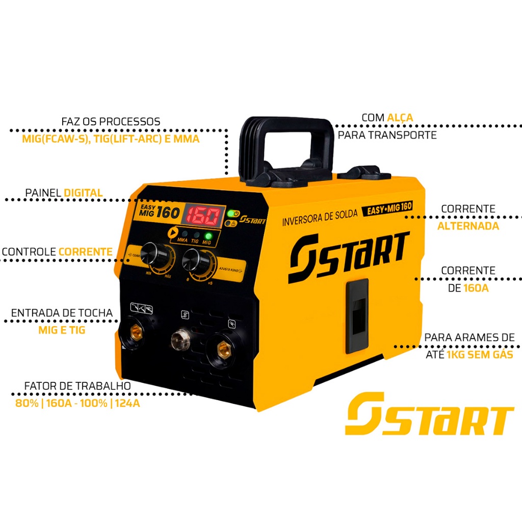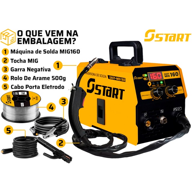Distribuído por Ismafer Ferramentas MÁQUINA DE SOLDA INVERSORA EASY MIG 160A 220V SEM GÁS - Start A Máquina de Solda Easy MIG 160A da Start é a escolha ideal para quem busca praticidade e eficiência em trabalhos de soldagem pequenos e médios. Compacta e leve, permite realizar soldas com excelente acabamento nos processos MIG sem gás, MMA e TIG (Lift Arc). Projetada para oficinas, serralherias, funilarias e uso profissional, oferece ótimo desempenho com baixo consumo de energia e operação simples. VANTAGENS: - Equipamento multiprocesso: MIG sem gás, MMA e TIG (Lift Arc) - Excelente estabilidade de arco e acabamento profissional - Ideal para aço, inox e pequenas estruturas metálicas - Ajuste preciso de corrente e velocidade do arame - Estrutura leve e compacta, fácil de transportar - Ciclo de trabalho eficiente: 80% a 160A - Tocha MIG fixa de 1,70m já acoplada - Solda com arame de 1kg sem gás ESPECIFICAÇÕES TÉCNICAS: - Processos suportados: MIG, TIG (Lift Arc), MMA - Ciclo de trabalho: 80% @160A | 100% @124A - Dimensões (AxLxC): 30 x 16,5 x 32,5 cm - Velocidade do arame: 2,5 a 13m/min - Corrente máxima de entrada: 25A - Corrente nominal de entrada: 16A - Tensão de alimentação: 220VAC - Faixa de corrente: 10 ~ 160A - Diâmetro do arame: 1,0mm - Classe de proteção: IP21S - Tensão em vazio: 42V - Peso: 5,5kg CONTEÚDO DA EMBALAGEM: - 01 Cabo de alimentação 1,8m com plug 20A - 01 Máquina de solda Easy MIG 160A Start - 01 Rolo de arame de solda 500g (1,0mm) - 01 Tocha MIG fixa de 1,70m - 01 Manual de instruções - 01 Garra negativa 9mm - 01 Porta eletrodo MARCA & MODELO: - Modelo: EASY MIG 160A - Marca: Start + MÁSCARA DE SOLDA AUTOMÁTICA WH1000 A Máscara de Solda Automática WH1000 foi desenvolvida para oferecer máxima proteção, conforto e praticidade durante processos de soldagem. Leve e com design ergonômico, protege o operador contra partículas volantes frontais, radiação ultravioleta (UV), infravermelha (IV) e luminosidade intensa. Conta com sistema de escurecimento automático, que se adapta instantaneamente ao arco de solda, garantindo segurança visual sem a necessidade de levantar a máscara. Seu apoio de cabeça totalmente ajustável proporciona melhor encaixe, reduzindo a fadiga mesmo em longos períodos de uso. VANTAGENS: - Proteção total para os olhos e face contra radiações UV, IV e partículas. - Escurecimento automático que aumenta a produtividade e segurança. - Conforto superior, com ajuste de cabeça ergonômico e estrutura leve. USOS INDICADOS: - Indicada para soldagens em geral, como: - Solda elétrica (MMA) - Solda MIG/MAG - Solda TIG básica - Trabalhos em oficinas, serralherias, manutenção industrial e uso profissional ou hobby. FICHA TÉCNICA: - Estágio claro: DIN 3 - Estágio escuro: DIN 11 - Proteção UV: DIN 16 - Alimentação: Bateria de íons de lítio - Sistema: Escurecimento automático - Regulagem: Não possui Marca: Oz Modelo: WH1000 + Eletrodo MGM Fusion-AM - 500 Gramas - 102096-250MSISM Apresentamos o Eletrodo MGM Fusion-AM - Saq 500 Gramas - 102096-250MSISM, uma opção de alta qualidade para suas necessidades de soldagem. Este produto é conhecido por sua durabilidade e eficiência, tornando-o uma escolha popular entre os profissionais. Características: - Marca: MAGMA - Modelo: Fusion-AM . - Peso: 500 gramas. - Referência: 102096-250MSISM. - Quantidade: Aproximadamente 27 varetas por saco. Este eletrodo é ideal para uma variedade de aplicações de soldagem, oferecendo uma fusão consistente e confiável. Seja você um profissional experiente ou um entusiasta do faça-você-mesmo, o Eletrodo MGM Fusion-AM - Saq 500 Gramas - 102096-250MSISM é uma excelente adição à sua caixa de ferramentas. Nota: As imagens são apenas para fins ilustrativos. As cores e dimensões reais do produto podem variar ligeiramente das imagens mostradas. Compre agora e experimente a qualidade e a confiabilidade que só a MGM pode oferecer! ATENÇÃO:O produto pode ser enviado na medida 2,5mm ou 3,25mm de acordo com a disponibilidade em estoque. Garantia de fábrica: 90 dias + 2 Esquadros Magnético Para Solda 12 Kg Start Soldas O Esquadro de Solda 12kg é uma ferramenta essencial para soldadores e profissionais de metalurgia, proporcionando precisão e estabilidade durante o processo de soldagem. Fabricado com materiais de alta qualidade, este esquadro oferece durabilidade e resistência, suportando pesos de até 12 kg. Características: - Material Resistente: Construído com aço de alta qualidade, garantindo longa vida útil e resistência ao desgaste. - Peso Suportado: Capacidade de suportar até 12 kg, ideal para trabalhos pesados e complexos. - Precisão: Proporciona ângulos exatos para uma soldagem precisa - Versatilidade: Adequado para diversos tipos de soldagem, incluindo MIG, TIG e eletrodo revestido. SKU: KIT24123_23422_22879_24032x2 Distribuído por Ismafer Ferramentas