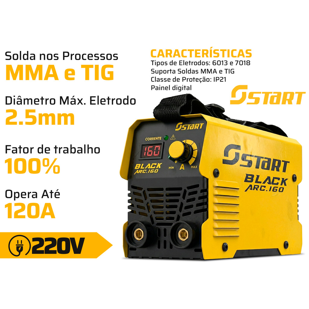 Distribuído por Ismafer Ferramentas MÁQUINA DE SOLDA INVERSORA PARA SERRALHEIRO 220V TIG ELETRODO MMA BLACK ARC 160A - Start DESCRIÇÃO: A Máquina de Solda Inversora Start Black Arc 160A é uma ferramenta portátil e eficiente, projetada para soldagem de alta qualidade com eletrodos de até 2,5mm; mm. Equipada com display digital, regulador de potência e turbo ventilação, ela oferece facilidade de manuseio, economia de energia e soldas com melhor acabamento. Ideal para processos MMA e TIG raspagem, é perfeita para profissionais e entusiastas que buscam precisão e desempenho. CONTEÚDO DA EMBALAGEM: - 01 Máquina Inversora de Solda Black Arc 160A 220V; - 01 Garra negativa 9 mm; - 01 Porta eletrodo 9 mm. VANTAGENS: - Alta capacidade de soldagem e cordão de solda com melhor acabamento; - Portátil com display digital para melhor visualização e controle; - Turbo ventilação e proteção com fusível térmico automático; - Economia de energia e soldas com menos faísca e fumaça; - Regulador de potência para ajustes precisos; - Suporta o processo TIG raspagem; - Fácil manuseio e transporte. FICHA TÉCNICA: - Materias soldáveis: Aço carbono, Ferro, Aço inoxidável; - Fator de Trabalho: 80% a 160A; 100% a 120A; - Corrente de entrada: 15-25 A máx; - Corrente de saída: 20A - 160A; - Tensão de entrada: 50/60 Hz; - Eletrodo: 6013 Até 2,5 mm; - Proteção de sobrecarga; - Com Tecnologia inverter; - Grau de proteção: IP21; - Grau de isolamento: F; - Tensão em vazio: 72V; - Tensão em vazio: 60V; - Potência: 3300W; - Voltagem: 220 V; - Conector: 9mm; - Anti-Stick. INDICADO PARA: - Aplicações profissionais e domésticas que exigem precisão e qualidade; - Soldagem com eletrodos de até 2,5mm; - Processos MMA e TIG raspagem. MARCA: Start MODELO: Black Arc 160 Garantia de fábrica: 180 dias SKU: 24693 Distribuído por Ismafer Ferramentas
