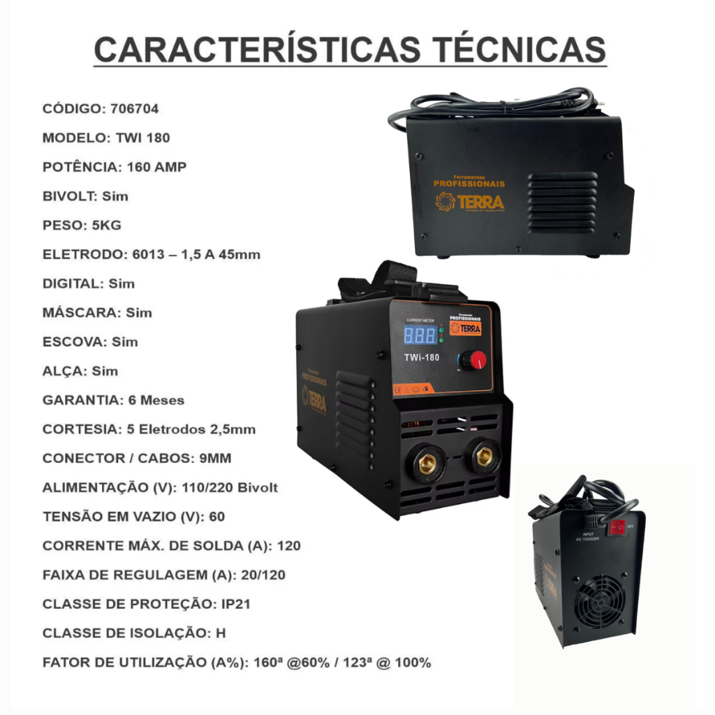 Máquina De Solda Inversora Inverter Profissional 110v/220v TERRA Máquina Inversora De Solda Twi-180 Com Display Digital 7067 Máquina inversora de solda TWI-180 Bivolt possui alto fator e potência de trabalho. Conta com display digital que permite regulagens com maior precisão e sistema de proteção contra sobrecargas de temperatura. De fácil transporte e leve, a máquina oferece alta resistência e praticidade de uso. Proporciona acabamento profissional em soldagem em aço inoxidável, aço, aço carbono, cobre e outros metais ferrosos. Possui painel simples e intuitivo, de fácil entendimento para seleção de processo e ajuste de corrente Tensão estável sem picos Graças à sua tecnologia inversora, você desfrutará de maior facilidade e qualidade na hora de soldar. Caracteriza-se por um menor consumo de energia e oferece um arco muito mais estável e seguro, sem picos de tensão. Além disso, você pode controlar a potência de saída com mais precisão graças à sua regulação eletrônica. Especificações: * Alimentação: 110/220V - Bivolt Automática. * Corrente de Alimentação: 17A. * Tensão em Vazio: 60V. * Corrente Máxima de Solda: 140A. * Faixa de regulagem: 20/160A. (Atinge 160A ligado na voltagem 220v) * Classe de Proteção: IP21. * Classe de Isolação: H. * Diâmetro do eletrodo (mm): 6013/7018 até 1,5 a 3,25 mm. * Máquina leve, compacta e de fácil transporte ? pesa apenas 5 kg. * Alto fator de trabalho e excelente potência para diversas aplicações. * Display digital prático, permitindo regulagens precisas de corrente. * Sistema de proteção contra sobreaquecimento, garantindo segurança e durabilidade. * Solda eletrodos de até 3,25 mm com ótimo desempenho. * Compatível com: OK Serralheiro 2.5 / 3.25 mm e OK 48.04 2.5 / 3.25 mm. * Resistente e confiável, equipada com sensor de proteção contra sobrecarga. * Painel intuitivo e simples, ideal para fácil seleção do processo e ajuste rápido da amperagem. Itens inclusos: * Máscara para solda com visor. * Cabo positivo. * Cabo com garra negativa. * Escova de aço. * Manual de instruções. Nuvem de Tags: Inversora De Solda, Máquina De Solda, Solda Elétrica, Inversora Portátil, Solda Profissional, Equipamento De Soldagem, Soldagem Eletrodo, Inversora Compacta, Painel Digital, Solda Doméstica, Ferramenta Industrial, EPI Soldagem, Manutenção Industrial, Soldagem Precisa, Inversora Profissional.