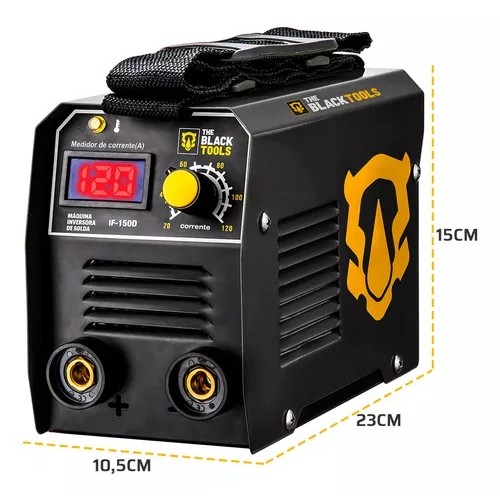 A The Black Tools é uma marca comprometida com a qualidade e as necessidades do cliente. Nosso objetivo é oferecer as melhores soluções para o seu dia a dia, com um design funcional e inovador. MAQUINA DE SOLDA ELETRICA INVERSORA 120A - IF150D A Máquina Inversora de Solda 120A possui tecnologia moderna e avançada, sendo ideal para serviços de solda em montagens e reparos de estruturas metálicas em geral. Compacta e leve, permite obter acabamento profissional. VANTAGENS: - Por ser um equipamento leve e pequeno facilita muito o trabalhos em locais de difícil acesso ou em altura elevada. - Solda aço, aço carbono, entre outros metais ferrosos; CARACTERISTICAS: - Solda MMA (Eletrodo) e também TIG, porém não acompanha tocha; - Funções: Hot Start, Ark Force e Anti Stick; - Não solda MIG. - Visor Digital. DIMENSÕES DOS CABOS: - Cabo de força (tomada): 1,50Mt; - Porta eletrodo e garra: 1,14Mt. ITENS INCLUSOS: - Alça para transporte. - Cabo Porta Eletrodo. - Fonte Inversora. Marca: The Black Tools Modelo: IF150 Peso: 2,100 Kg Dimensões (AxLxP): 15 x 10,5 x 23 cm Garantia: 06 Meses + MÁSCARA DE SOLDA AUTOMÁTICA SEM REGULAGEM DIN 11- GALZERMáscara de Solda automática é a união entre o passado e o futuro, unindo o de melhor entre duas gerações de máscaras de solda.A comodidade da máscara contemporânea que fica presa a cabeça com a durabilidade do escudo de solda.VANTAGENS:- Fabricada em polipropileno, protege 100% contra faíscas, raios ultravioletas (UV) e infravermelho (IV) nas condições normais de soldas.- Campo de visão abrangente de 110x90mm que possibilita uma amplo campo de visão de todo o trabalho.- Com um visor fixo com índice de escuridão de DIN 11.CARACTERÍSTICAS:- Aceita Outras Lentes de Escurecimento.- Visão Panorâmica de 110 x 90mm.- Fabricada em Polipropileno.- Carneira Ajustável.FICHA TÉCNICA:- Temperatura de armazenamento: -20 ~ 70oC.- Dimensões do filtro: 110 x 90 x 10 mm.- Temperatura de operação: -5 ~ 55oC.- Proteção do filtro UV/IR : DIN 15.- Estágio escuro: DIN 11.- Estágio claro : DIN 4.Marca: GALZERModelo: Sem RegulagemPeso: 480 gGarantia: 03 Meses + 02 - ESQUADROS MAGNÉTICO PARA SOLDADOR SERRALHEIRO 12KG; 500g - ELETRODO MGM FUSION-AM -2,50MM (Aprox. 27 varetas); 01 - PAR DE LUVAS SEM PIGMENTO PRETO. SKU: KIT24056_19307_22463_22879_23774x2