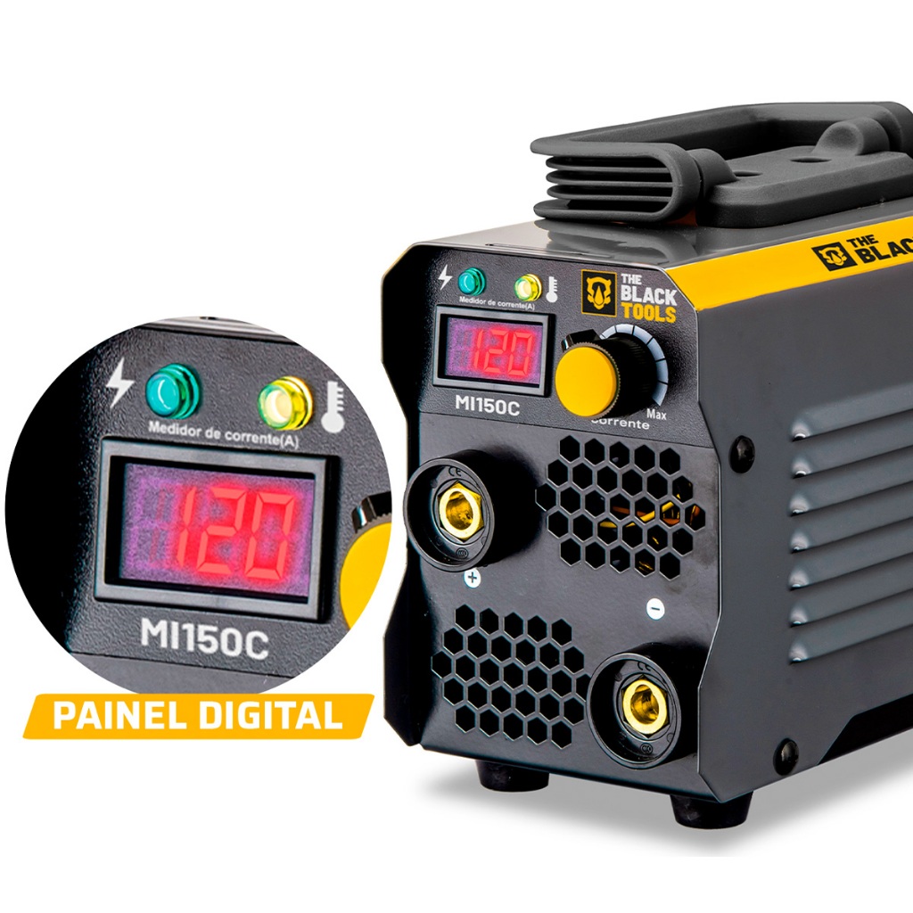 Distribuído por Ismafer Ferramentas Descrição: MAQUINA DE SOLDA ELETRICA INVERSORA COM VISOR DIGITAL MI150C 120A - The Black Tools A Máquina Inversora de Solda MI150C 120A possui tecnologia moderna e avançada, sendo ideal para serviços de solda em montagens e reparos de estruturas metálicas em geral; Esse modelo permite obter acabamento profissional, pois tem maior flexibilidade entre os processos de soldagem; Compacta, leve e com design inovador. CARACTERISTICAS: - Solda MMA (Eletrodo) e também TIG, porém não acompanha tocha; - Funções: Hot Start, Ark Force e Anti Stick; - Por ser um equipamento leve e pequeno facilita muito o trabalhos em locais de difícil acesso ou em altura elevada; - Possui visor digital para melhor visualização do trabalho exigido; - Não solda MIG. DIMENSÕES DOS CABOS: - Cabo de força (tomada): 1,50Mt; - Porta eletrodo e garra: 1,14Mt. ITENS INCLUSOS: - Alça para transporte; - Cabo Porta Eletrodo; - Fonte Inversora; - Escova De Aço; - Inversora. Marca: The Black Tools Modelo: MI150C Garantia: 06 meses pelo fornecedor SKU: 23869 Distribuído por Ismafer Ferramentas