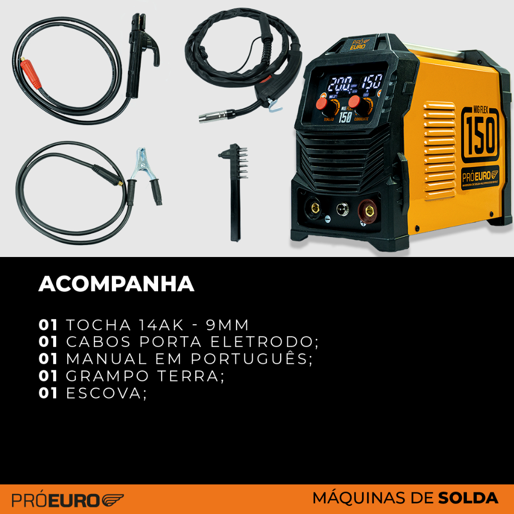 A MIG Flex 150A Pró Euro destaca-se pela versatilidade em campo. Com sistema bivolt automático, permite operar com agilidade nos processos MIG sem gás, MMA e TIG Lift, sendo o equipamento ideal para reparos rápidos, funilaria e serviços que demandam pronta resposta. PRINCIPAIS VANTAGENS: Multiprocesso 3 em 1: MIG (sem gás), MMA e TIG Lift Bivolt Automática: reconhecimento imediato de tensão 127V ou 220V Portátil e eficiente: otimizada para serviços externos e de difícil acesso Soldagem MIG sem necessidade de cilindro de gás Proteção contra superaquecimento de alta confiabilidade Painel intuitivo para rápida configuração de parâmetros INFORMAÇÕES TÉCNICAS: Tensão: 127V / 220V (Bivolt) - 60 Hz Potência máxima de consumo: 6 kVA Faixa de corrente: 30A a 150A Hot Start e Anti-stick integrados Grau de proteção: IP21S Conectores com engate rápido padrão 9 mm PESOS E DIMENSÕES: Dimensões da Máquina (CxLxA): 335 x 175 x 280 mm Dimensões da Caixa (CxLxA): 440 x 255 x 335 mm Peso da Máquina: 5 kg Peso total (Caixa/Máquina/Acessórios): 7,2 kg PROCESSOS DE SOLDAGEM: MIG Sem Gás MMA (Eletrodo Revestido) TIG Lift (tocha não inclusa) CAPACIDADE DE SOLDAGEM: Arame MIG: Até 1 kg (0,6mm, 0,8mm e 1,0mm) Eletrodos E6013 e E6010: até 3,25 mm Eletrodos E7018: até 3,25 mm Ferro fundido e Inox: até 2,5 mm CICLO DE TRABALHO: MIG: 60% – 150A | 100% – 105A MMA: 60% – 120A | 100% – 100A ACOMPANHA: 1x Tocha Removível 14AK 9mm 1x Cabo grampo terra 1x Cabo porta-eletrodo 1x Escova de Aço 1x Manual de Instruções