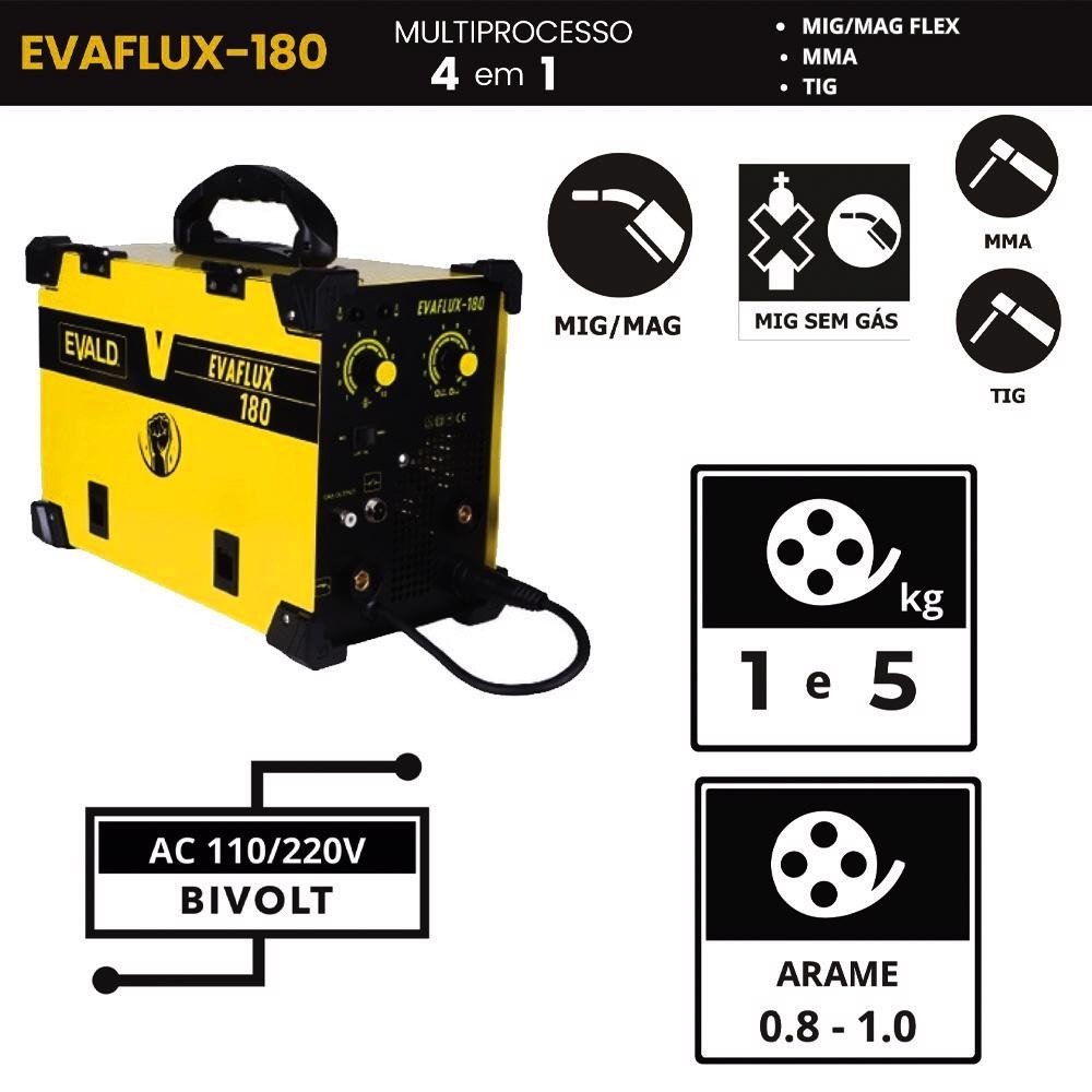 Máquina de Solda Multiprocesso MIG, MIG sem Gás, TIG e Eletrodo EVAFLUX-180 Bivolt EVALD