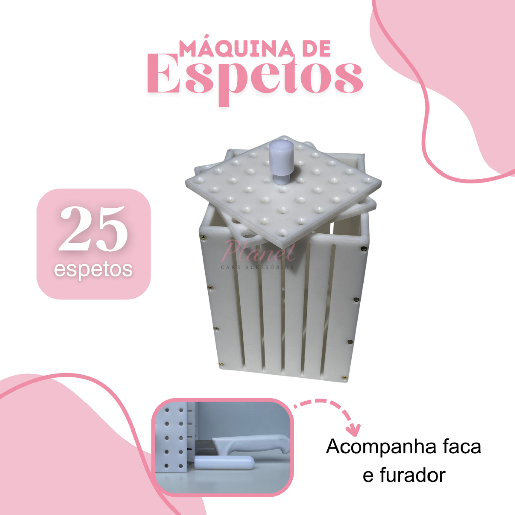 FAZ parte do kit Pronta para usar -Tampa Guia em PEAD -Base em PEAD -1 insersor de palito -1 Faca 9 polegadas Opções Disponiveis 16 espetinhos 25 espetinhos 36 espetinhos Formadora de Espetinhos São José você poderá fabricar dezenas de espetinhos com qualidade profissional, em apenas poucos minutos. Faça espetinhos de carne bovina, de frango com bacon, carne suína, frutas, vegetais, peixes, queijos, e muitos mais! Por padrão, cada espetinho poderá ter aproximadamente entre 70 grs e 120 grs, variando de acordo com a quantidade ou tipo de carne inserida pelo usuário. s Formadora fabricada em PEAD (Atóxico).