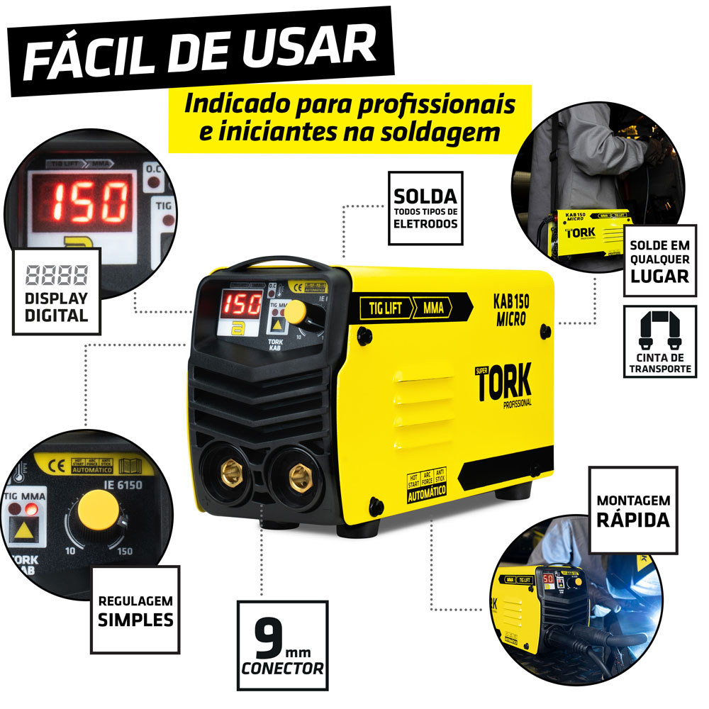 Você estará comprando: 01 Máquina de Solda IE-6150-220V 01 Porta eletrodo, 01 Garra do terra 01 Alça de transporte; 01 Mascara Arc Solar MSEA-601 02 Esquadros Magnéticos 12kg 01 Lente Interna 01 Lenta Externa 01 Bateria A MELHOR TECNOLOGIA DE SOLDA DO MUNDO EM SUAS MÃOS! O inversor de solda IE-6150-220V Super Tork Profissional foi projetado com intuito de modernizar e facilitar os trabalhos de solda. Produto combinado 2X1 a fonte de solda tem a capacidade de realizar 2 processos de soldagem como TIG-LIFT e MMA. Com placa eletrônica construída em base SMD (montagem robótica) e inserção de componentes de alta qualidade a fonte de solda possui longa vida útil e baixo nível de manutenções. Com tecnologia IGBT aplicada em seu bloco de potência, a fonte de solda proporciona uma potente corrente de solda e baixo consumo de energia elétrica. Em sua construção eletrônica, dispositivos térmicos de proteção e cooler de alta capacidade de refrigeração aumentam seu ciclo de trabalho, segurança e produtividade em conjunto. Os inversores SUPER TORK foram projetados para tornar o seu trabalho mais rápido e fácil. As prioridades ao projetar esta máquina foram para facilitar a operação e manutenção, além de oferecer segurança, conforto e confiabilidade. Função MMA Eletrodo Revestido; Função TIG-LIFT (Possibilita a solda de chapas finas e proporciona melhor acabamento) tocha não inclusa; Solda todos os tipos de eletrodos, tais como: E6013, E7018, alumínio, inox e ferro fundido; Alta capacidade de solda e ótimo ciclo de trabalho; HOT-START MMA (Facilidade de abertura de arco elétrico com vários tipos e diâmetros de eletrodos); ARC-FORCE MMA (Controle de estabilidade de arco inteligente, mantem o arco balanceado com corrente + tensão); ANTI-STICKING MMA (Desabilita a corrente de solda quando eletrodo gruda, fácil remoção e segurança na solda); Tecnologia IGBT, potente corrente de solda e baixo consumo de energia elétrica; Indicador de proteção térmica (Segurança e inteligência); Display Digital (Facilidade e precisão de ajuste); Turbo ventilada (alta eficiência de refrigeração); CICLO DE TRABALHO MMA - ELETRODO REVESTIDO Eletrodo 2,0mm - 100% Eletrodo 2,5mm - 100% Eletrodo 3,2mm - 100% CICLO DE TRABALHO TIG-LIFT Tungstênio - 1.6 - 100% Tungstênio - 2.0 - 100% Tungstênio - 2.4 - 80% Informações Técnicas: Marca: Super Tork Potência: 4.800w Frequência: 60hz Voltagem: 220v Ligação: Tomada (20A) já instalada Corrente de entrada eficiente: 18A Tensão no Vazio: 73V Amperagem mínima: 10A Amperagem máxima: 150A Diâmetro do eletrodo: 2,0 ~ 3,2mm Conector: 9mm Hot Start: Automático Arc Force: Automático Anti Stick: Automático Dimensões Aproximadas AxLxC: 132x85x208mm Peso: 1.8Kg *** DÚVIDAS FREQUENTES: *** Qual a garantia? Seu inversor possui 02 (DOIS) anos de garantia contra vícios de fabricação, sendo 9 de meses garantia contratual + 3 meses de garantia legal + 12 meses de garantia adicional. Para garantia adicional, basta fazer o preenchimento do formulário no site do fabricante, você ganhará 12 meses adicionais à garantia contratual! Quais materiais conseguimos soldar com este equipamento? MMA – ELETRODOS REVESTIDOS: Aço Carbono, Aço Inox, Ferro Fundido, Alumínio, Metalon, Perfil Metálico, Chapas Automotivas, Carrocerias, Estruturas metálicas entre outros materiais ferrosos! TIG DC: Aço Carbono, Aço Inox, Ferro Fundido, Metalon, Perfil Metálico, Chapas Automotivas, Carrocerias, Estruturas metálicas entre outros materiais ferrosos! Qual a vantagem de soldar com o processo MMA eletrodo revestido? O eletrodo revestido é considerado o processo mais versátil, pois solda qualquer material. São facilmente encontrados no mercado, possuem um valor acessível e não requer habilidades avançadas em soldagem. No processo MMA – ELETRODO REVESTIDO o único consumível é o próprio eletrodo. Qual a vantagem de soldar com o processo TIG? O processo TIG (ALTA FREQUENCIA ou LIFT) é considerado o processo para melhor acabamento. Devido ao seu estilo de soldagem o processo TIG garante uma excelente fusão dos materiais com belíssimo resultado final. O processo TIG proporciona resultados mais limpos, sem respingos, sem escoria e sem a necessidade de retrabalhos como lixas ou passes. No processo TIG é necessário ter: Vareta de adição TIG, Eletrodo de Tungstênio, Cilindro de Gás, Regulador de Gás e Tocha TIG completa.